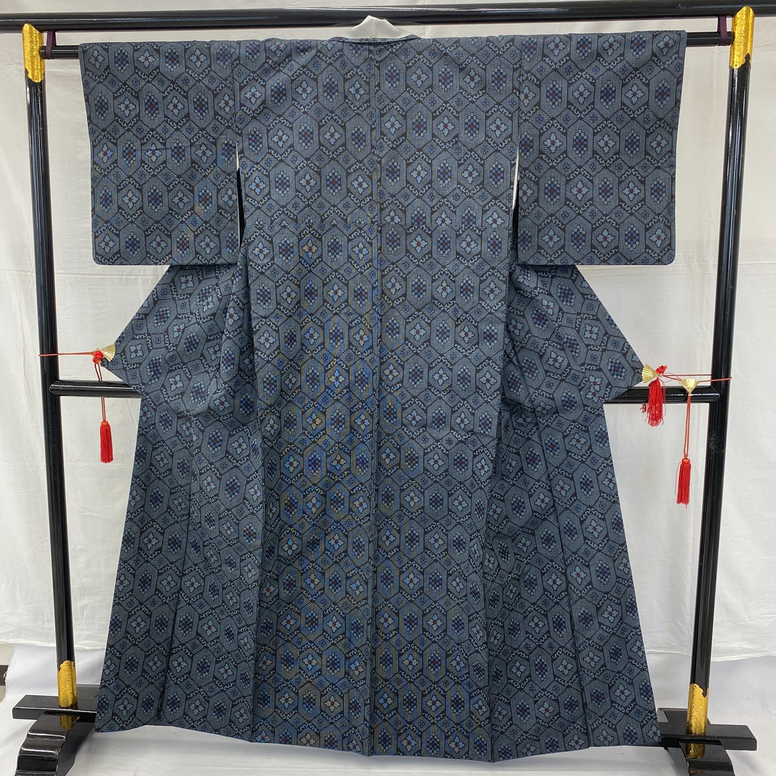 Japanese Vintage Kimono Silk Navy Oshima Traditional Authentic Length 62 in