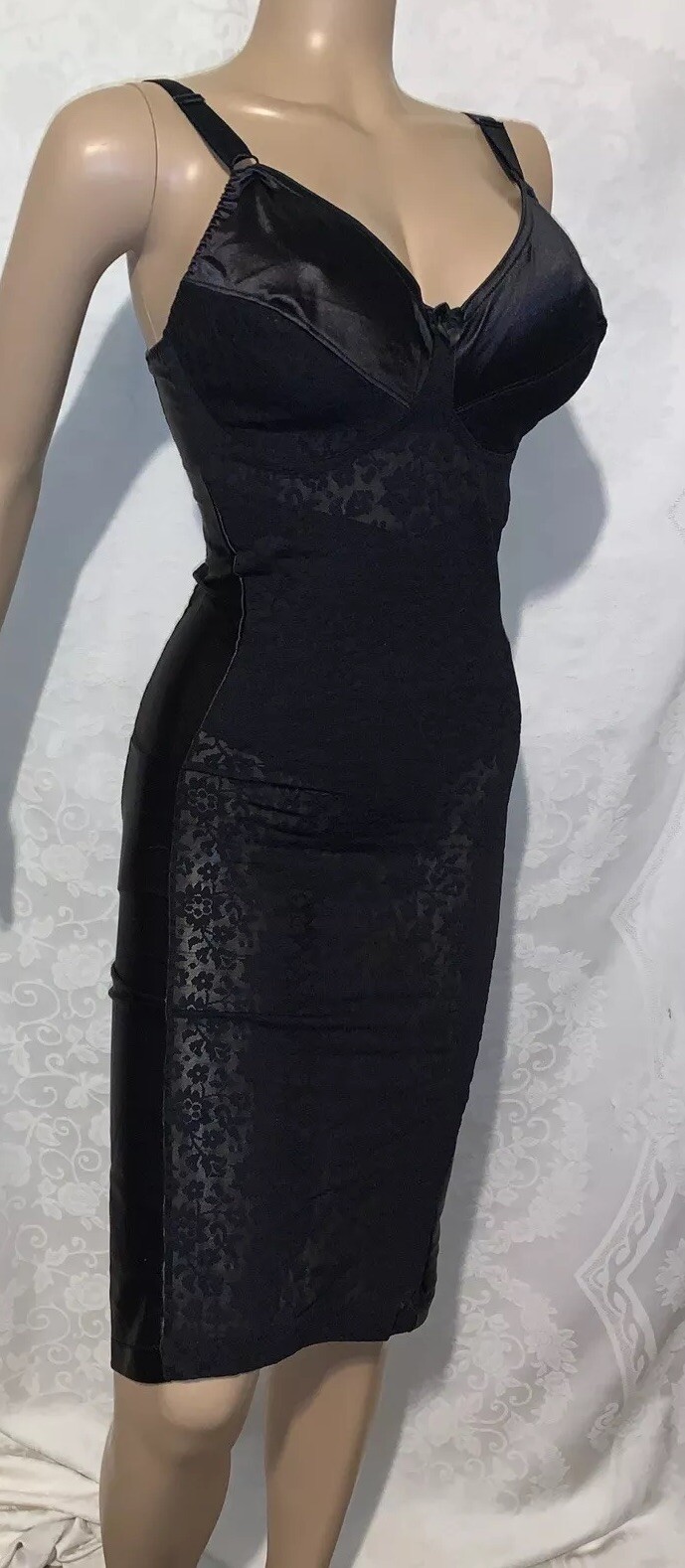 38 D DD Vtg New Nylon Spandex Black Satin Lace Girdle Bra FULL SLIP Body Shaper