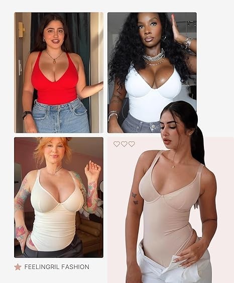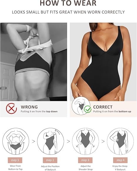 FeelinGirl Shapewear Bodysuits Tummy Control Deep V Neck Black Large