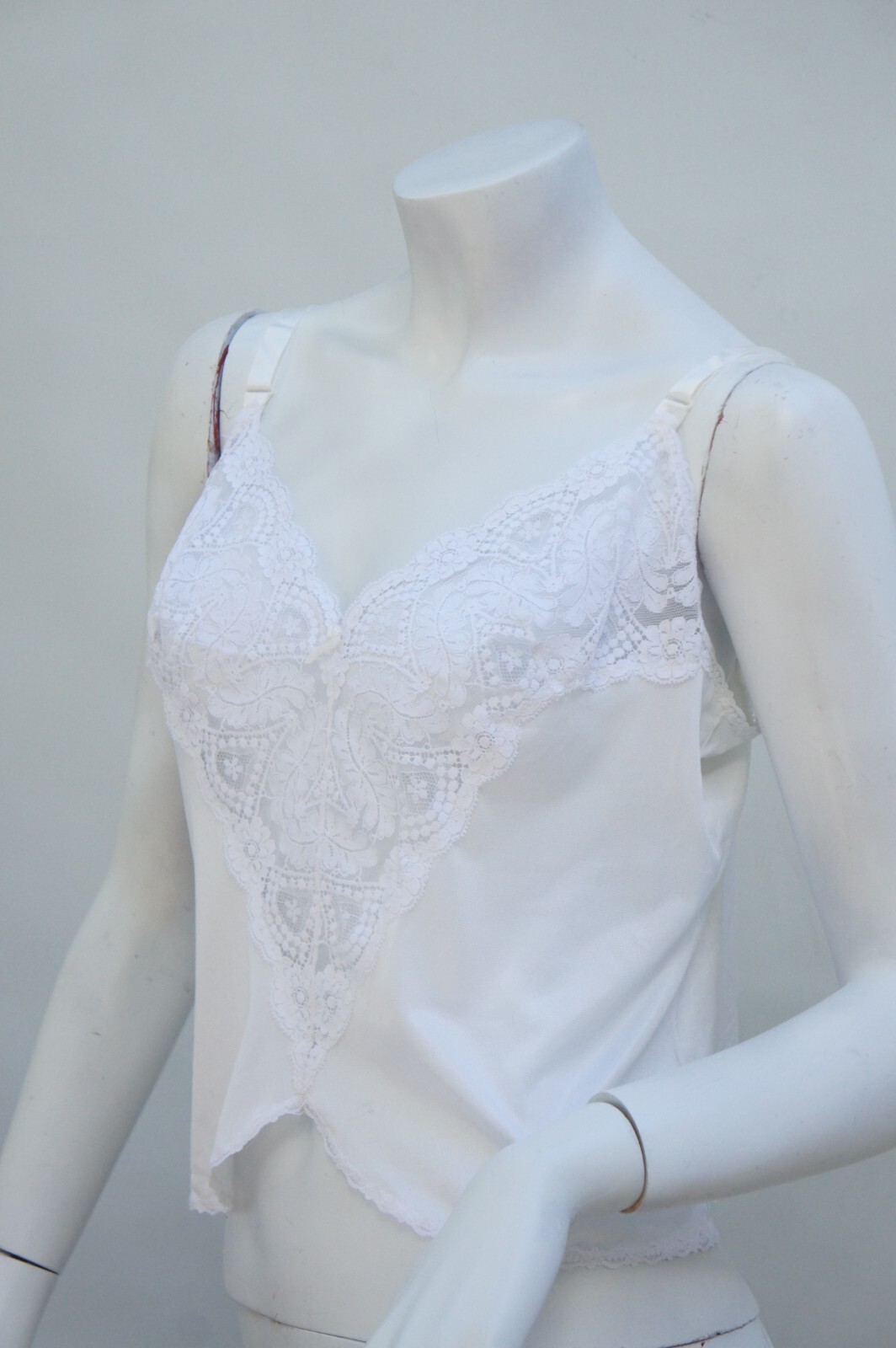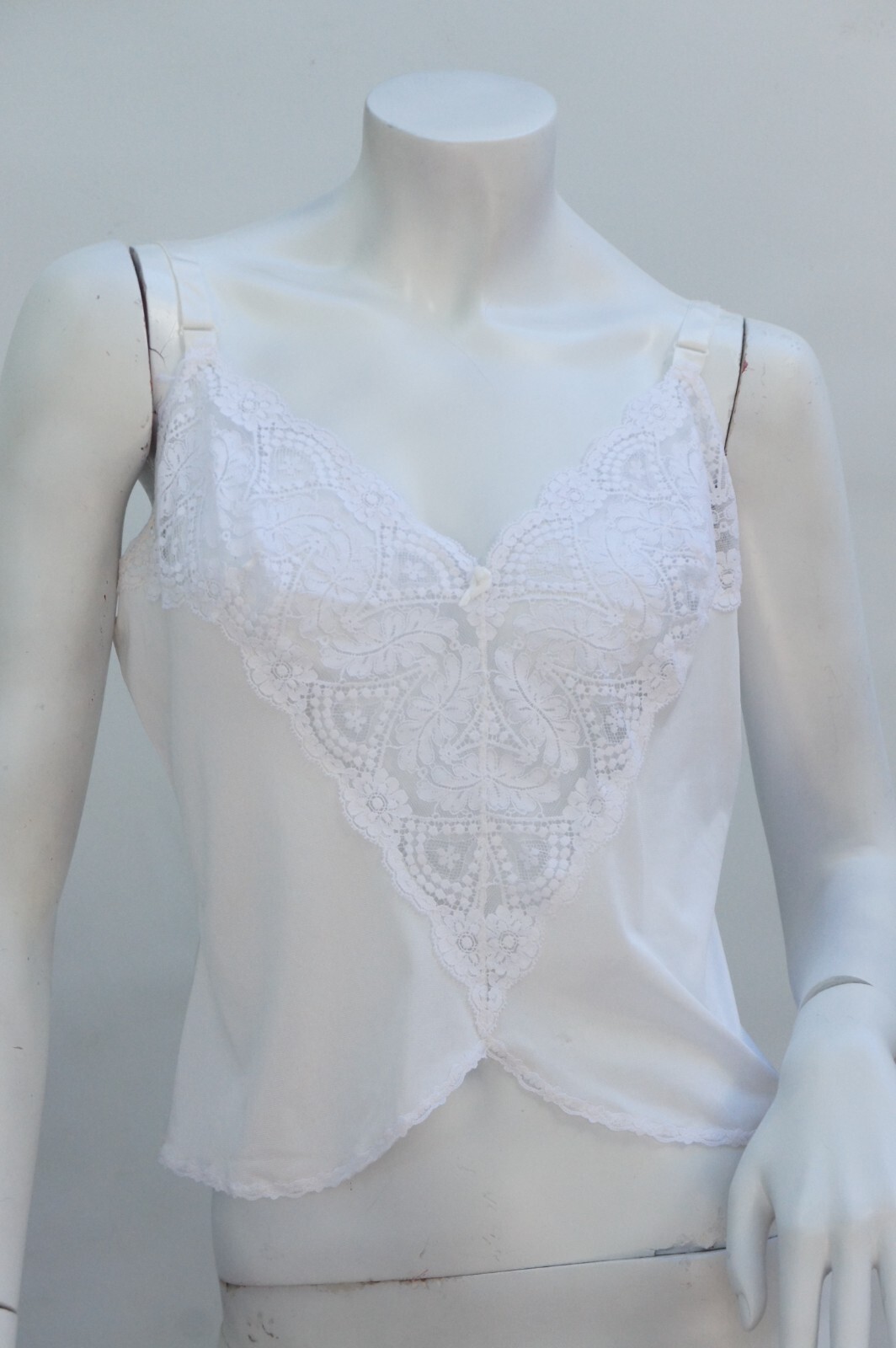 Vintage 70s White Lace Trim Nylon Camisole Slip Top Tank Lingerie Cottagecore Bo