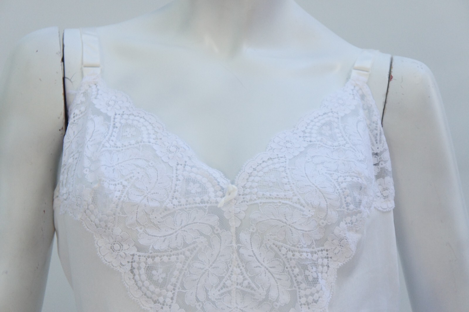 как выглядит Vintage 70s White Lace Trim Nylon Camisole Slip Top Tank Lingerie Cottagecore Bo фото