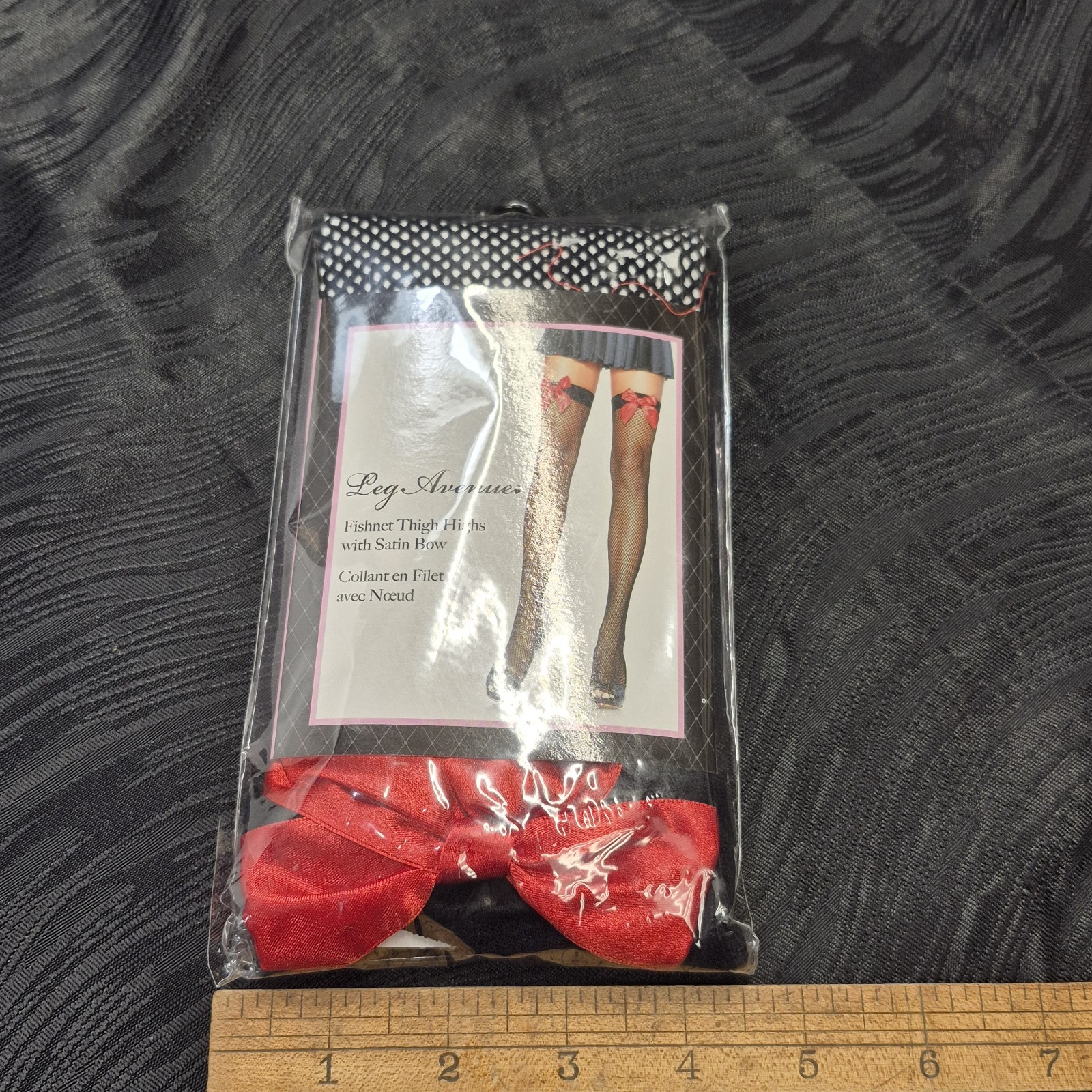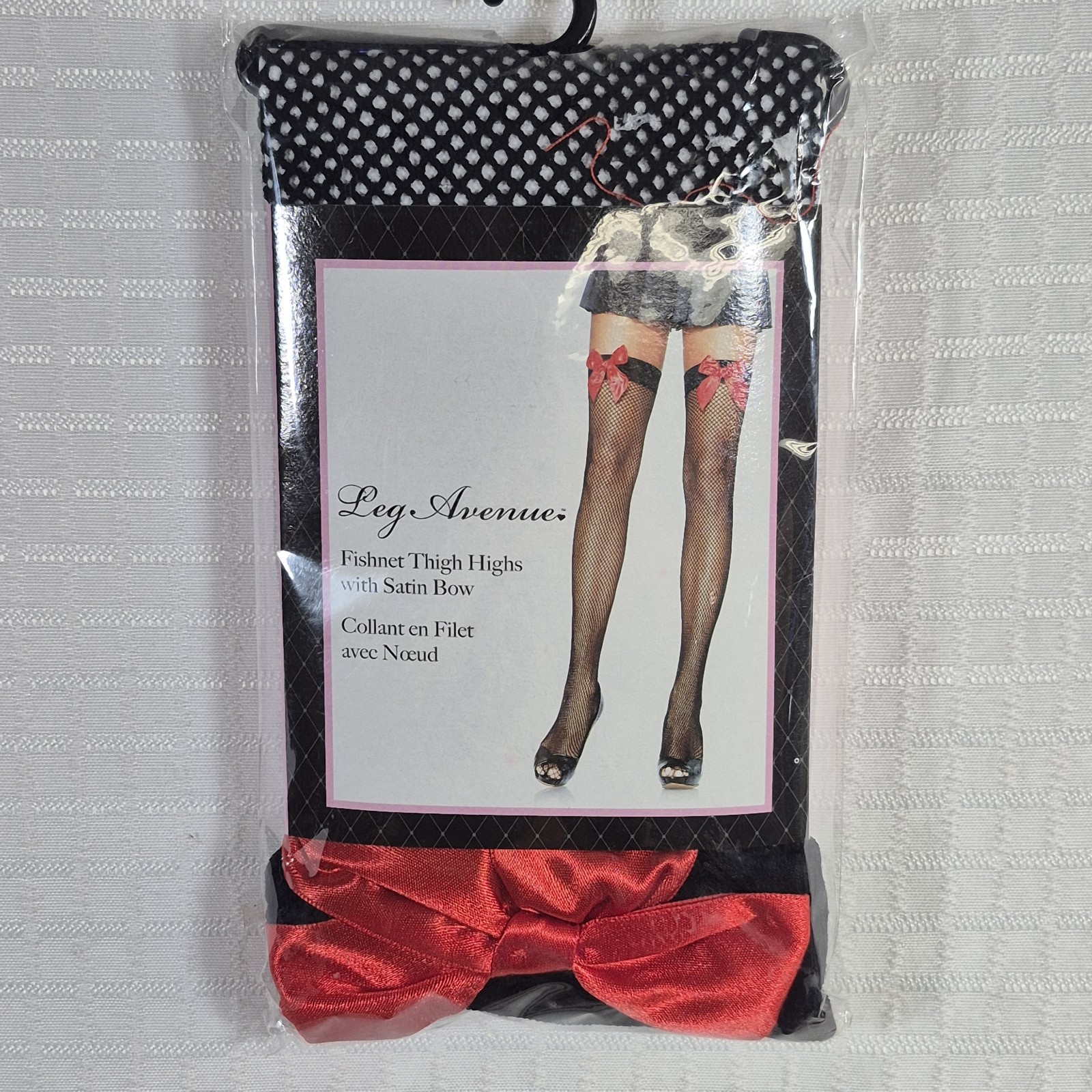 как выглядит Leg Avenue Black Fishnet thigh high stockings with Red Satin Bows NOS фото