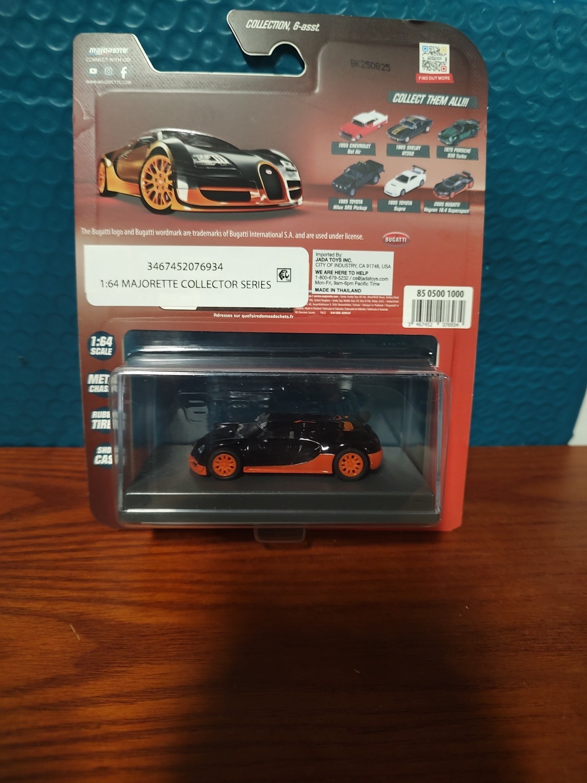 как выглядит 2025 MAJORETTE 2005 BUGATTI VEYRON 16.44 SUPER SPORT BLACK /ORANGE WHEELS фото