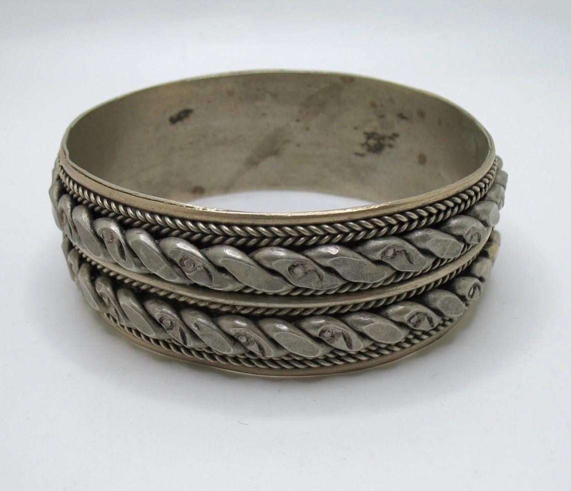 Vintage/antique wide Berber Moroccan silvered brass bangle bracelet