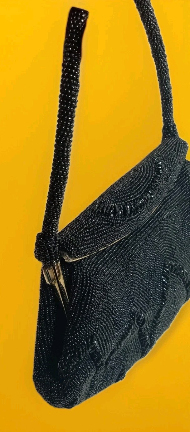 ANTIQUE K G CHARLET BAG JAPAN Black Micro Beaded/DESIGN Handbag ART DECO EUC