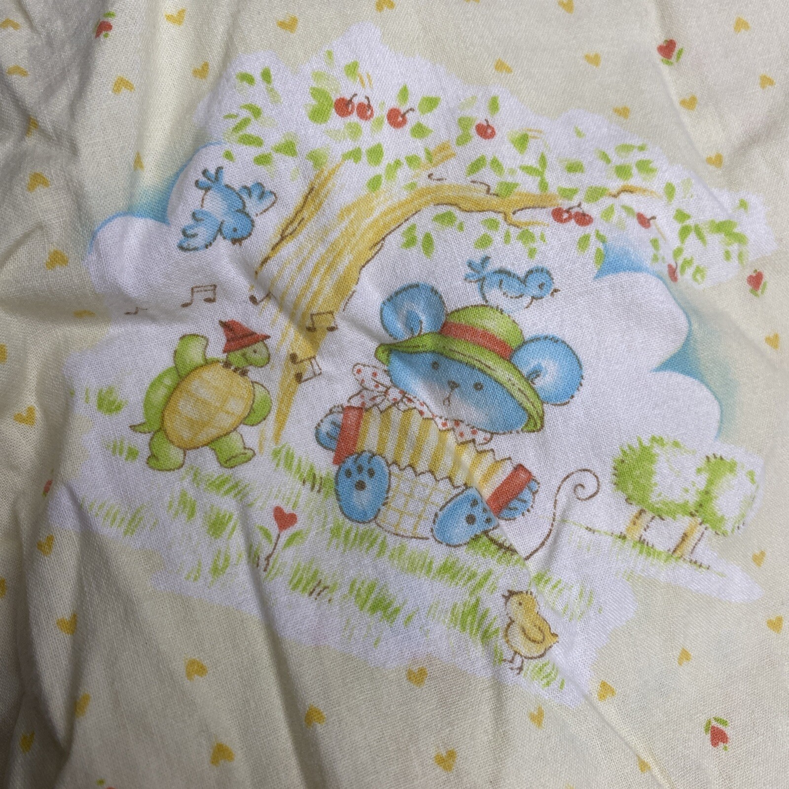 как выглядит Vtg Crib Sheet Yellow Animals Bunny Cats Birds Apple Trees 21x50 фото