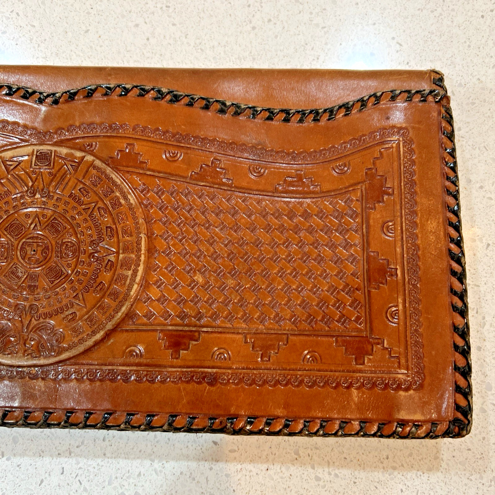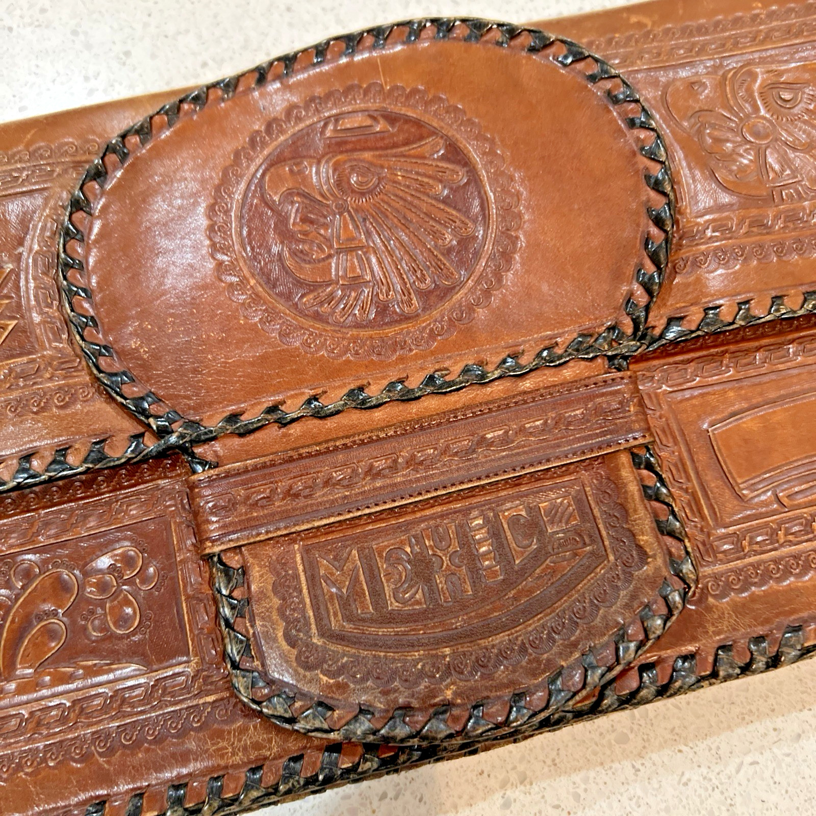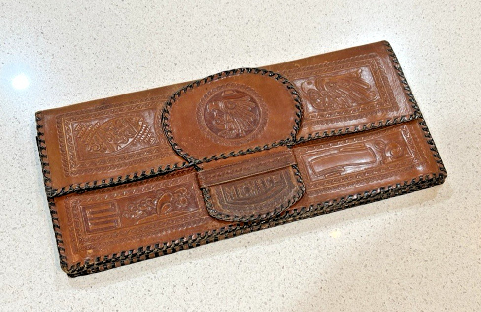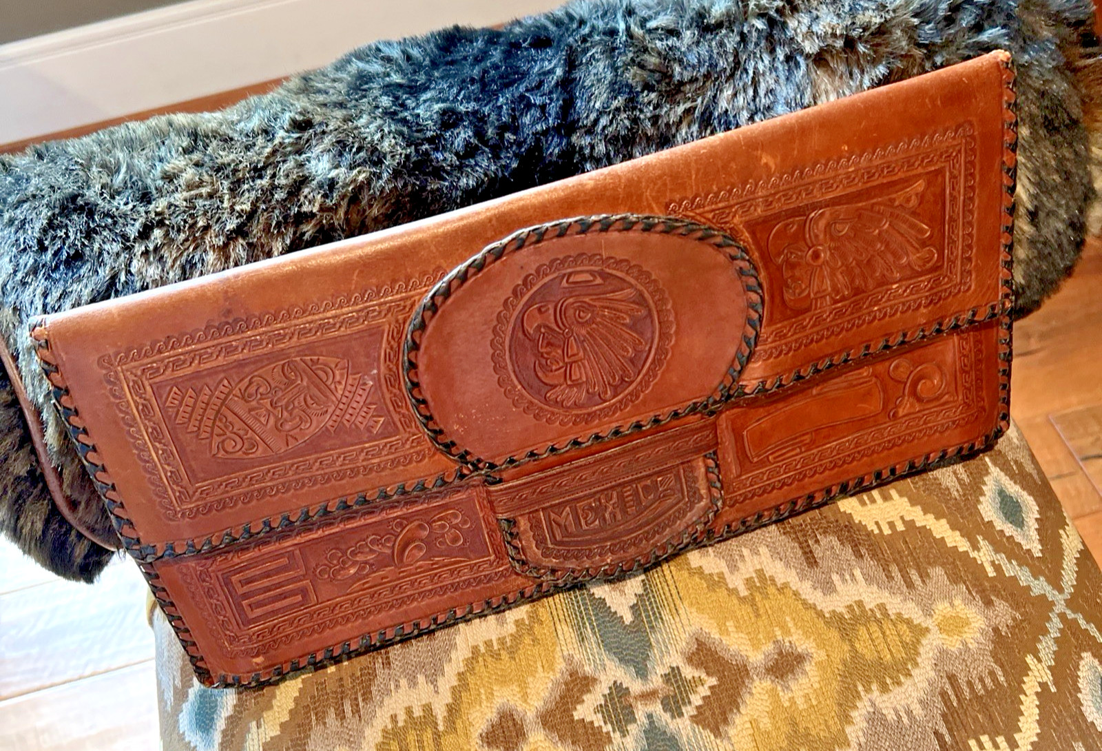 VTG. 1940's MEXICAN HAND TOOLED LEATHER PURSE CLUTCH BUSINESS BAG LARGE 15 3/4