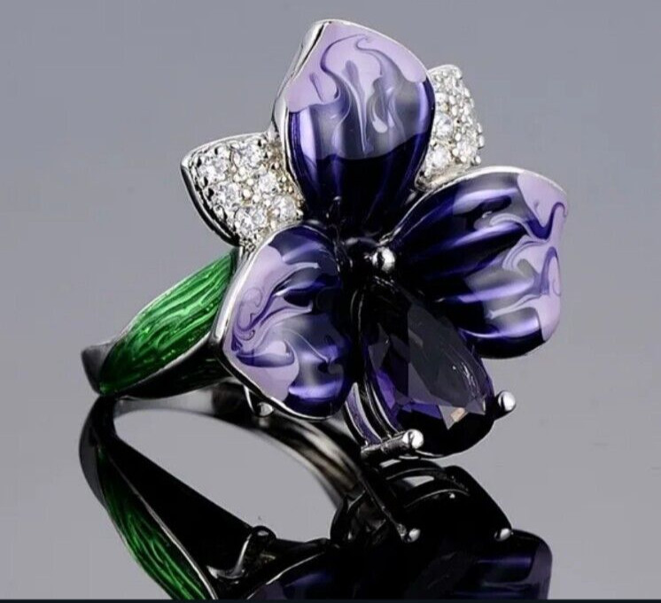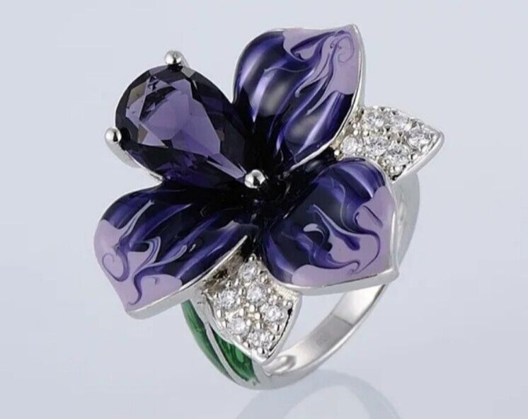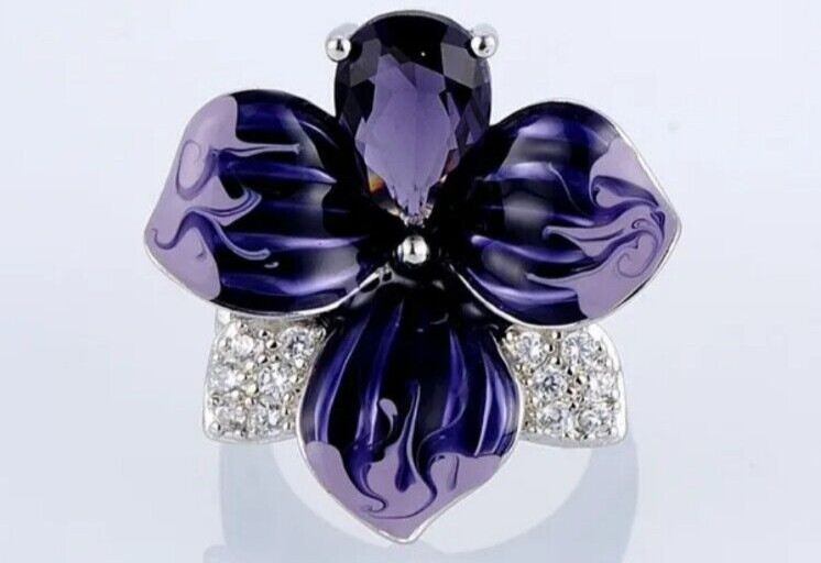 как выглядит Handcrafted Amethyst Flower Ring w/Gemstones 925 Silver Plated Size 5 фото