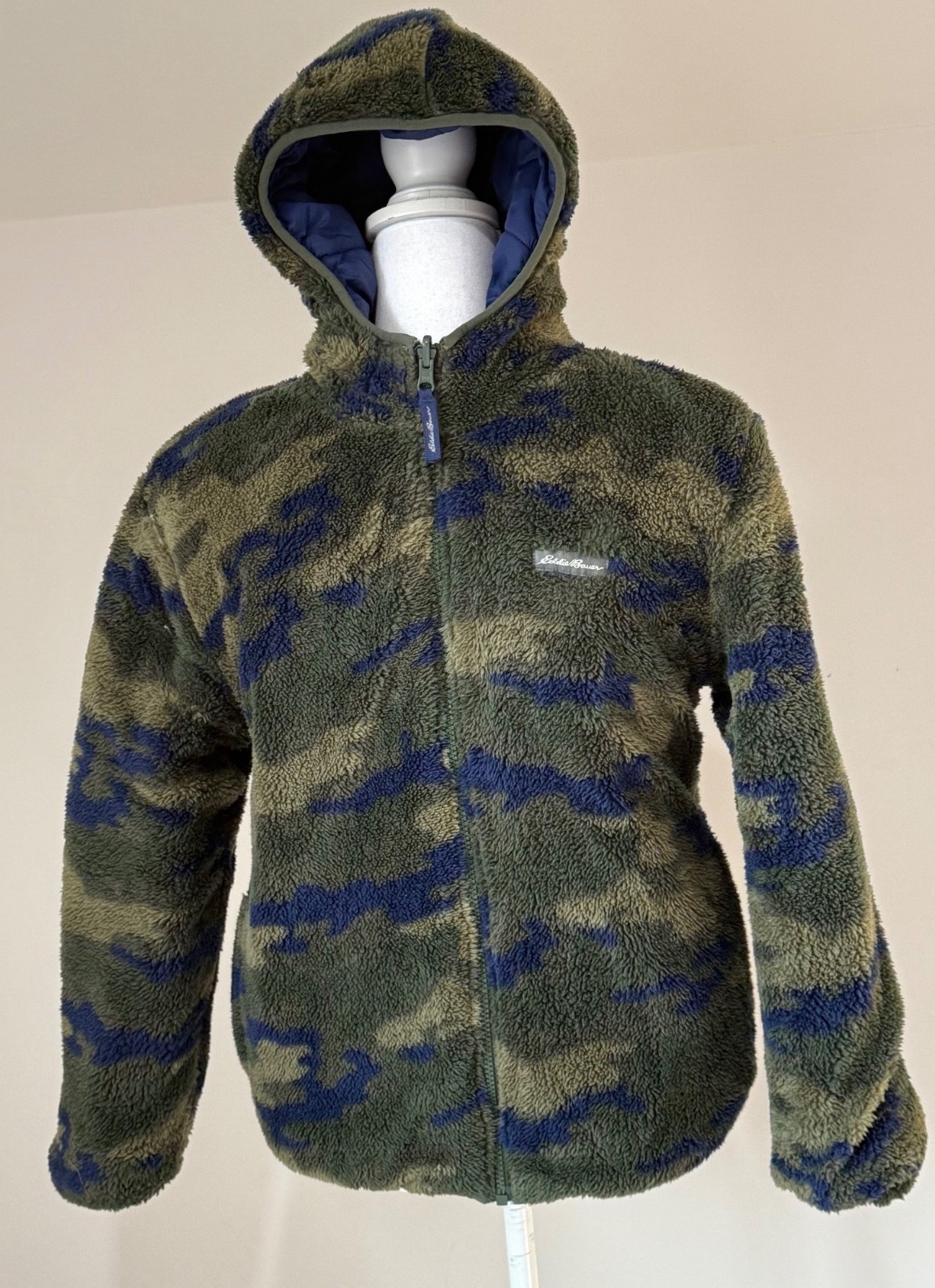 как выглядит Eddie Bauer Jacket Boys Size 14 Reversible Navy / Camo Fleece Hooded Coat фото