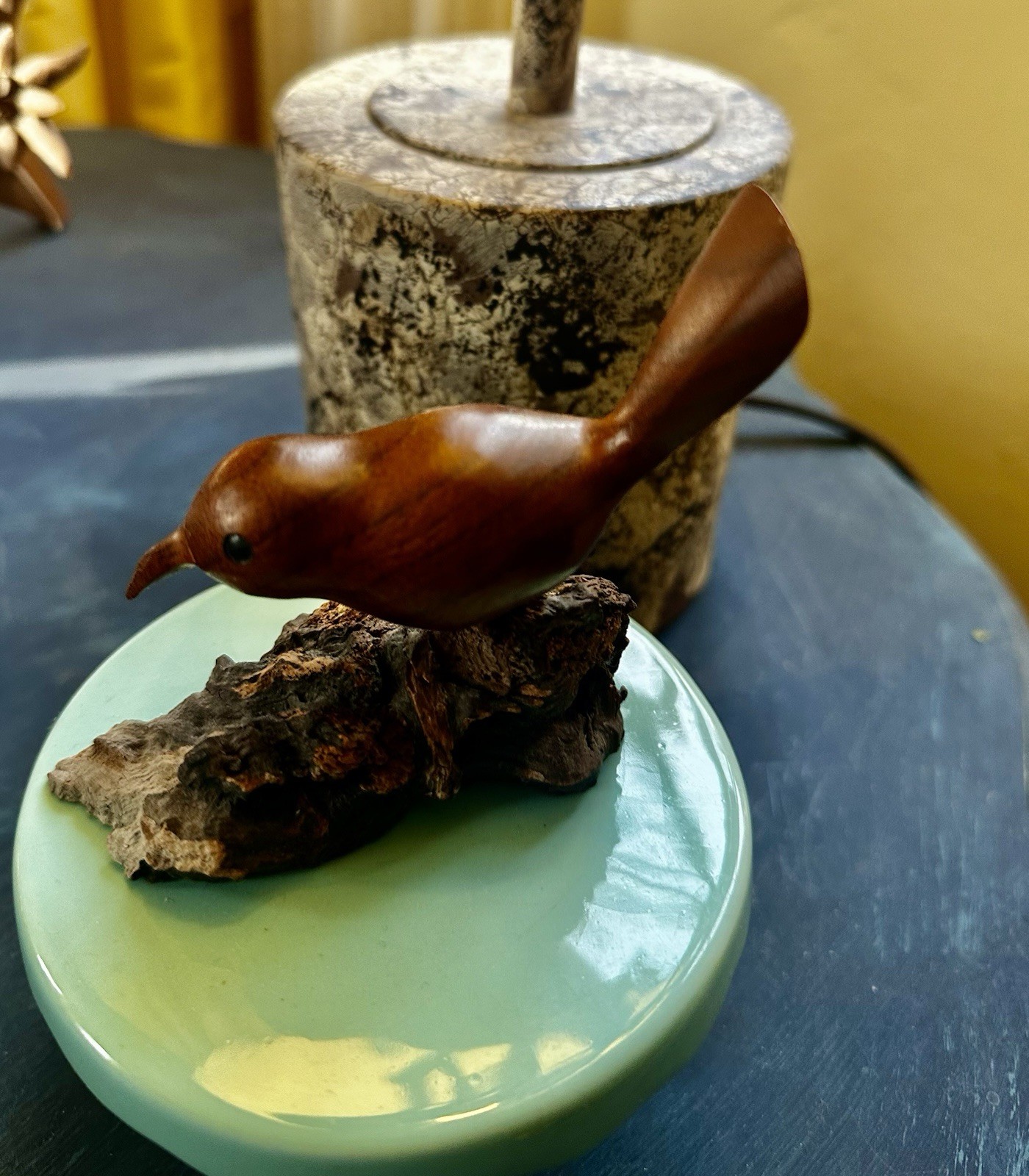 • Vintage Hand Carved Wooden Bird Sculpture on Natural Wood Base Folk Art