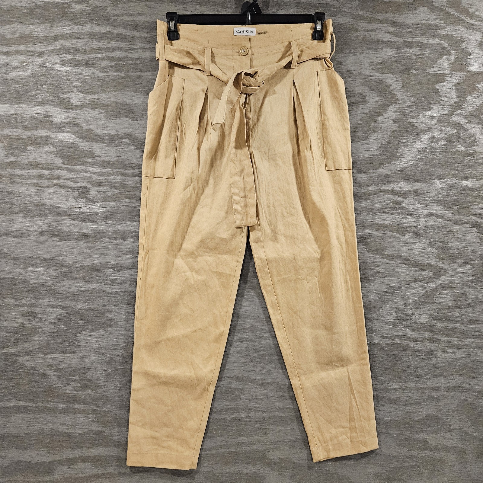 Calvin Klein SZ 4 Tan Belted Paperbag Pleated Linen Blend Pant Utility Pockets
