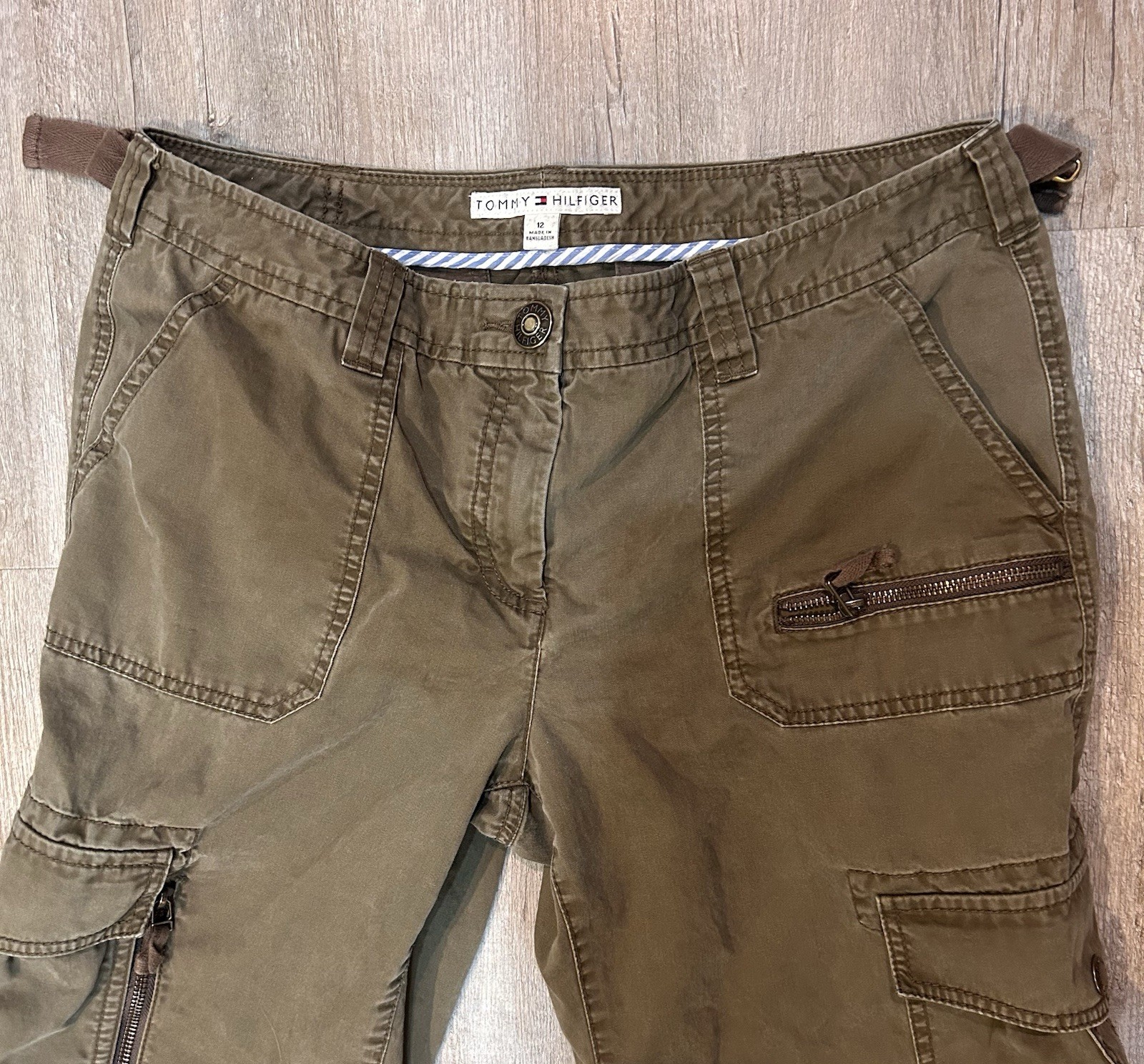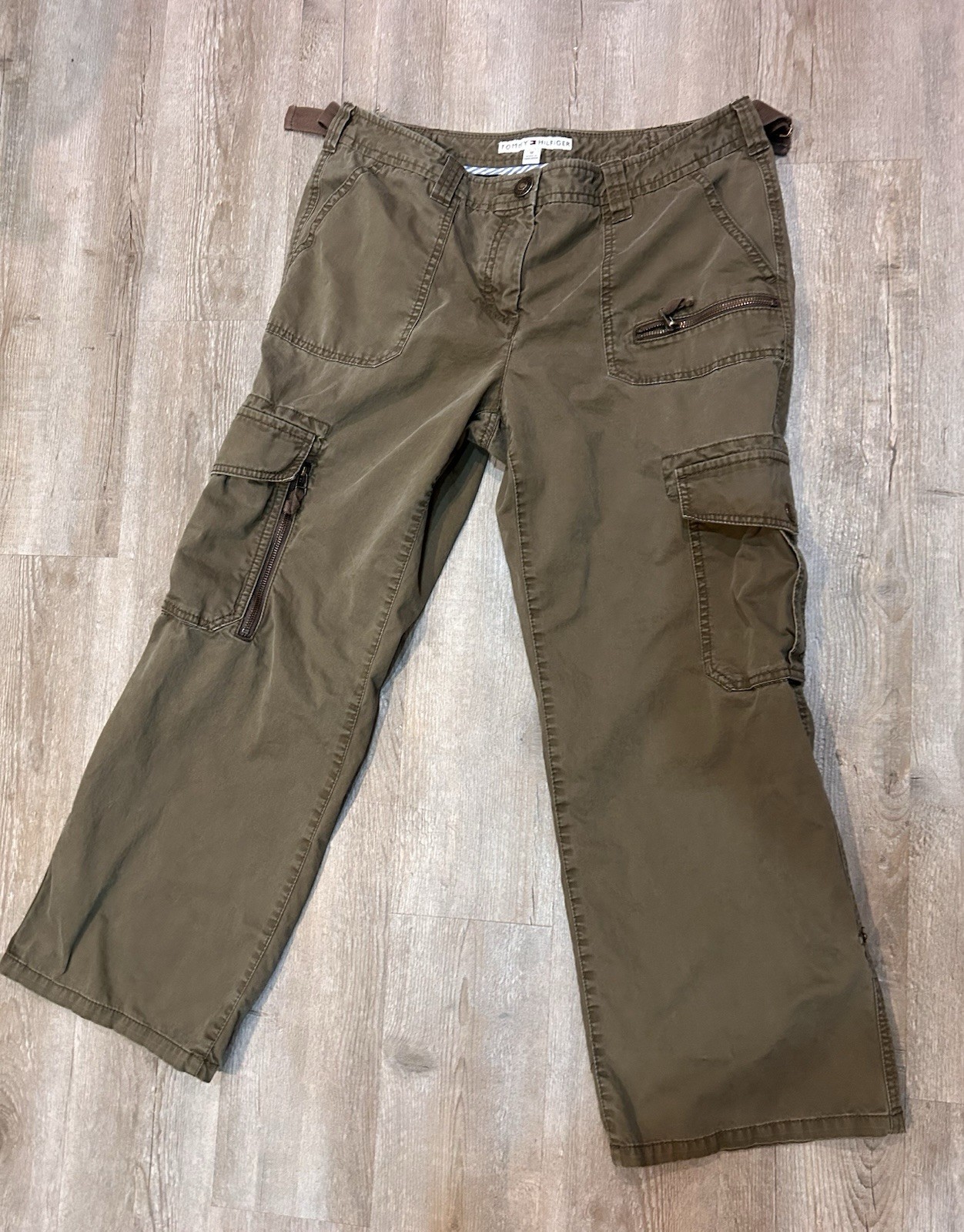 как выглядит Y2K Tommy Hilfiger Cargo Utility Wide Pants Women s SZ 12 Pockets Zippers Olive фото