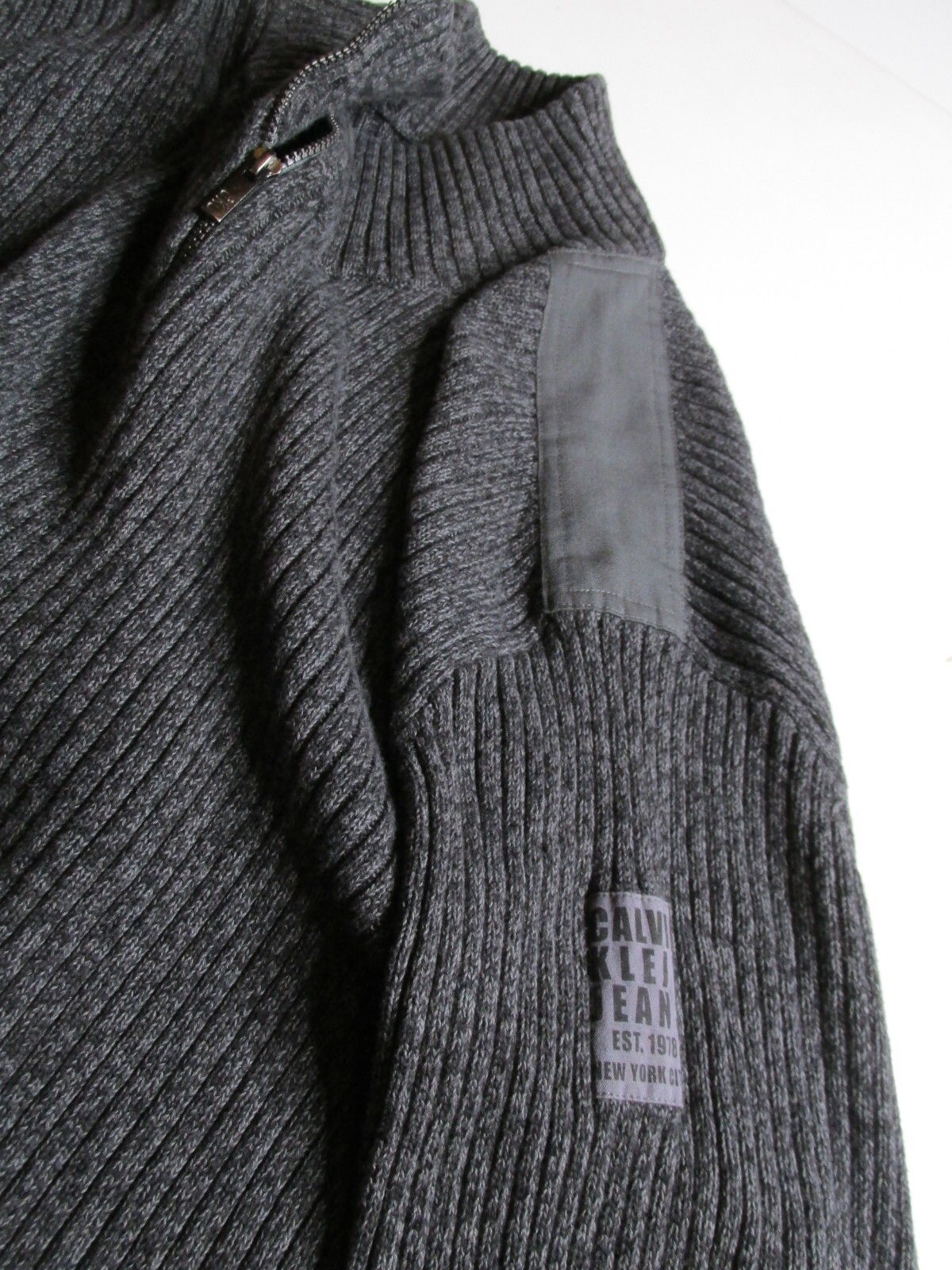 CALVIN KLEIN 1/4 Zip Sweater Men 2XL Charcoal Gray Cotton Logo Patch Ribbed