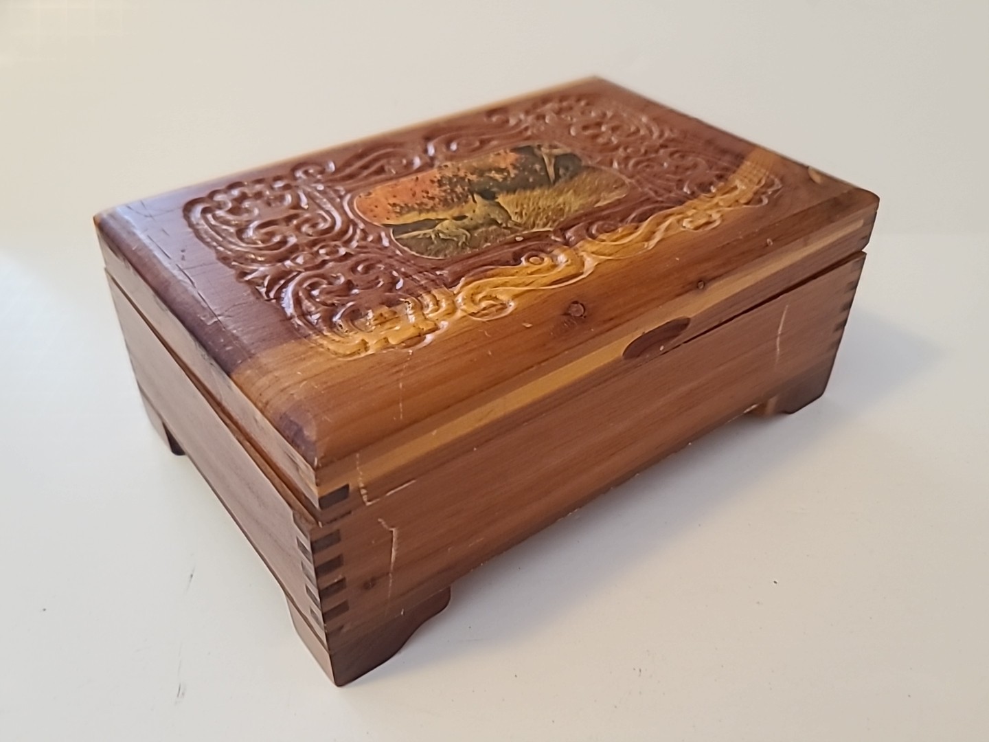 Vintage Wood Carved Trinket Jewelry Box W/ Dog 8x5x3