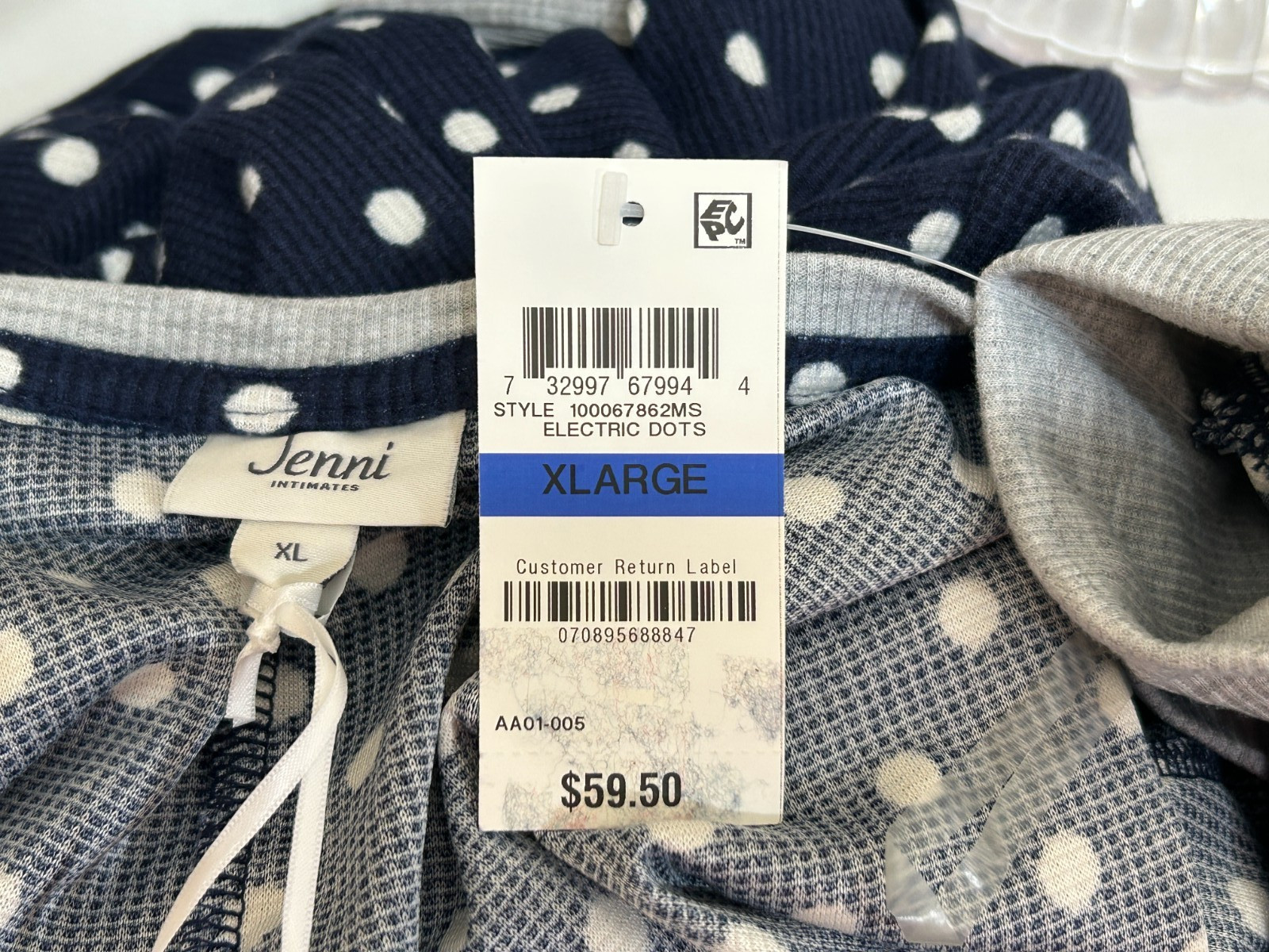 Jenni One Piece Thermal Pajamas XL Banded Ankle PJs Polka Dot Navy White Gray