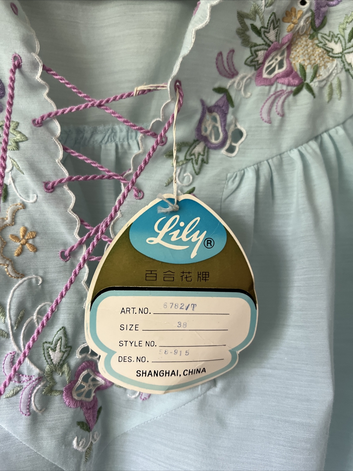 Vintage 1960's Lily Hand Embroidered Lightweight Nightgown Blue NWT L XL