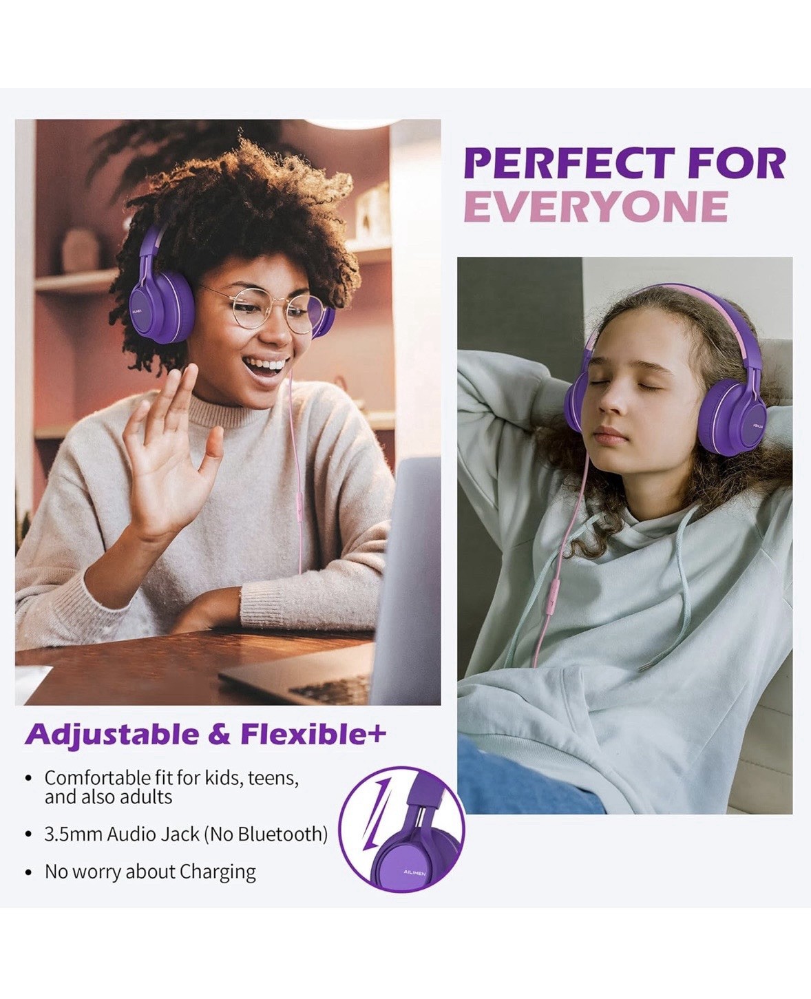 Girls Headphones, On-Ear Headphones Wired Purple Pink 3.5 Mm Jack