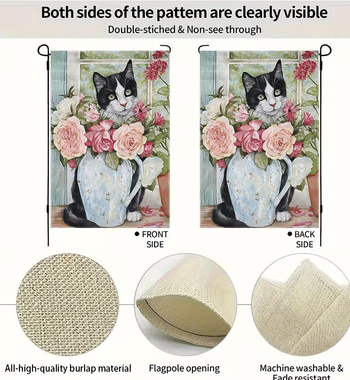 как выглядит "New" Tuxedo Cat In Florals, Two-Sided Burlap Type Outdoor Garden/Yard Flag фото