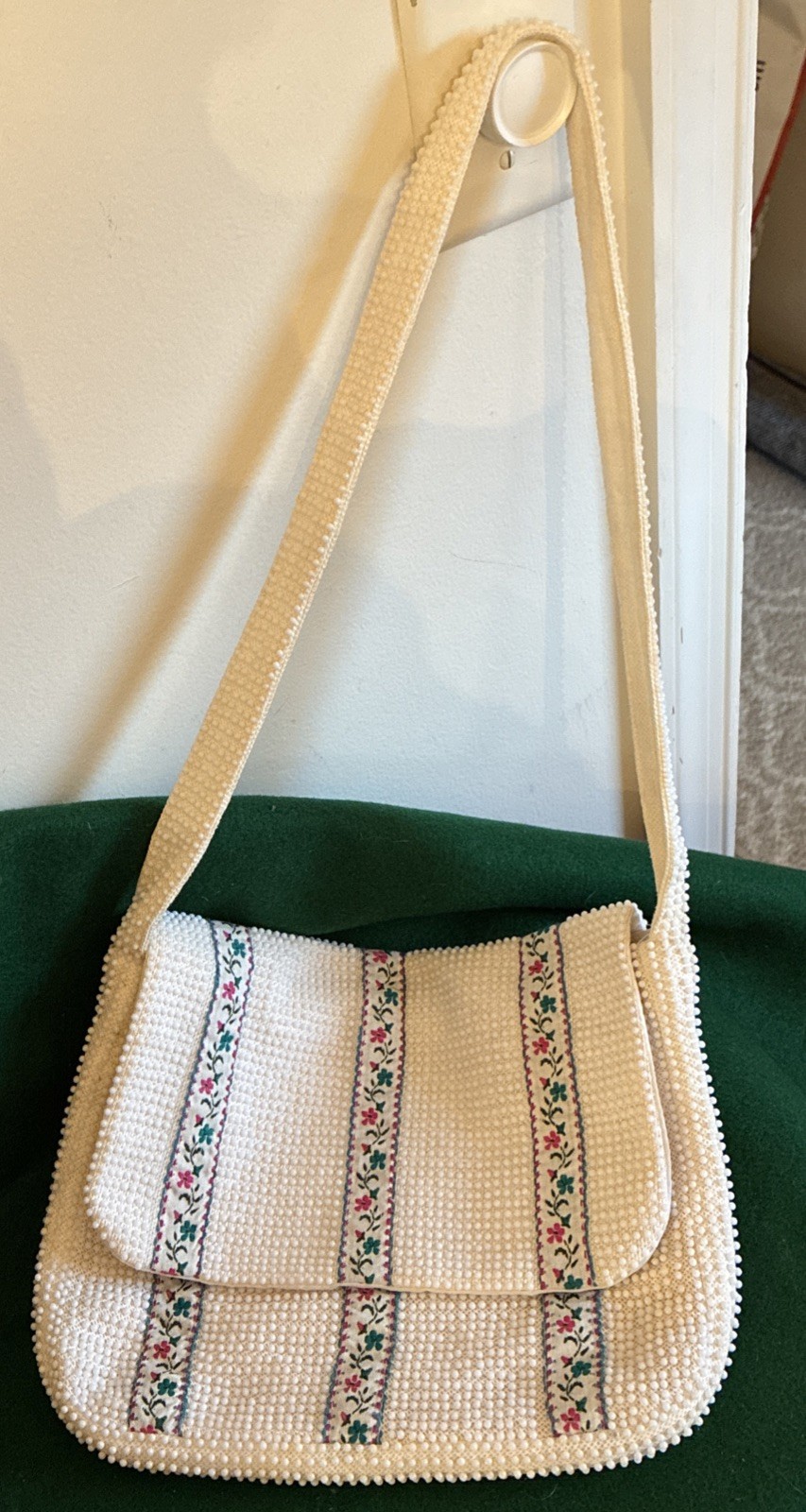 как выглядит Vintage Handmade White Beaded Shoulder Purse Flap Opening Ribbon Trim Hong Kong фото