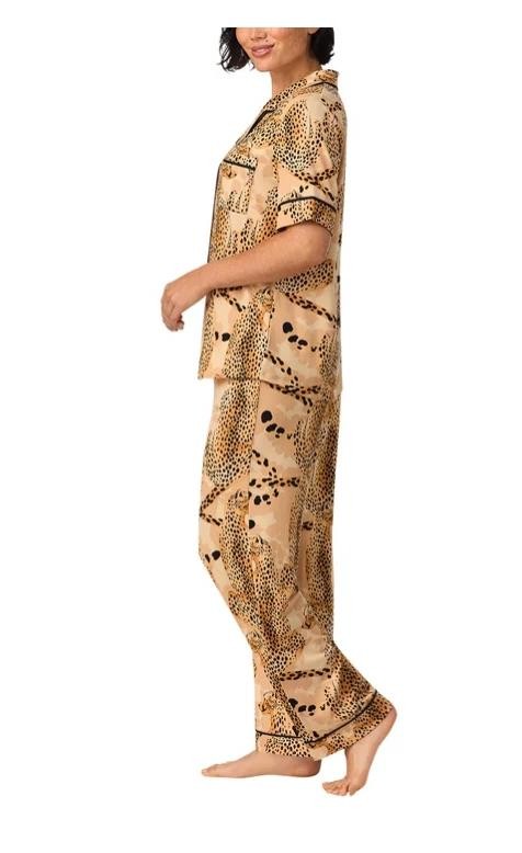 Room Service Womens Pajama Set Tan Leopard Pockets Short Sleeves Top Pants