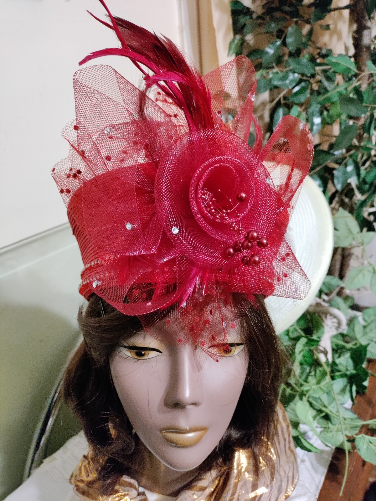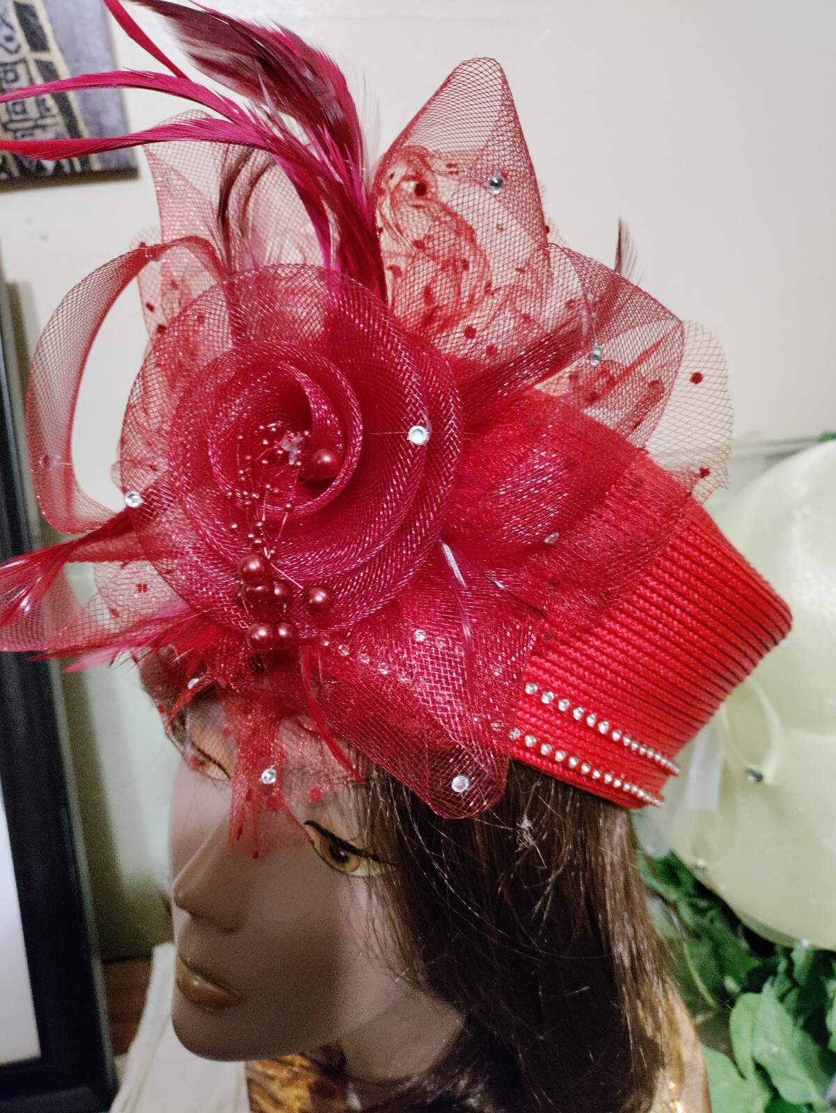 как выглядит Ladies Church, Derby, Easter, Special Occasion Hat, Rhinestone, Bead Mesh Trim фото