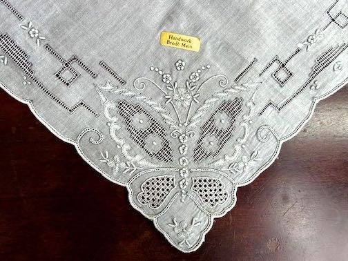 VINTAGE HANKY HANKIE BRODE MAIN NEW WHITE EMBROIDERY HANDWORK TAGS BUTTERFLY