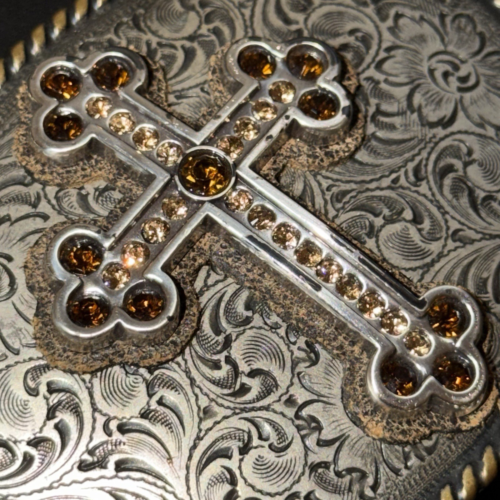 • Nocona Buckles Amber Stones Cross Silver Gold Tone Metal Oval Belt Buckle Cowboy