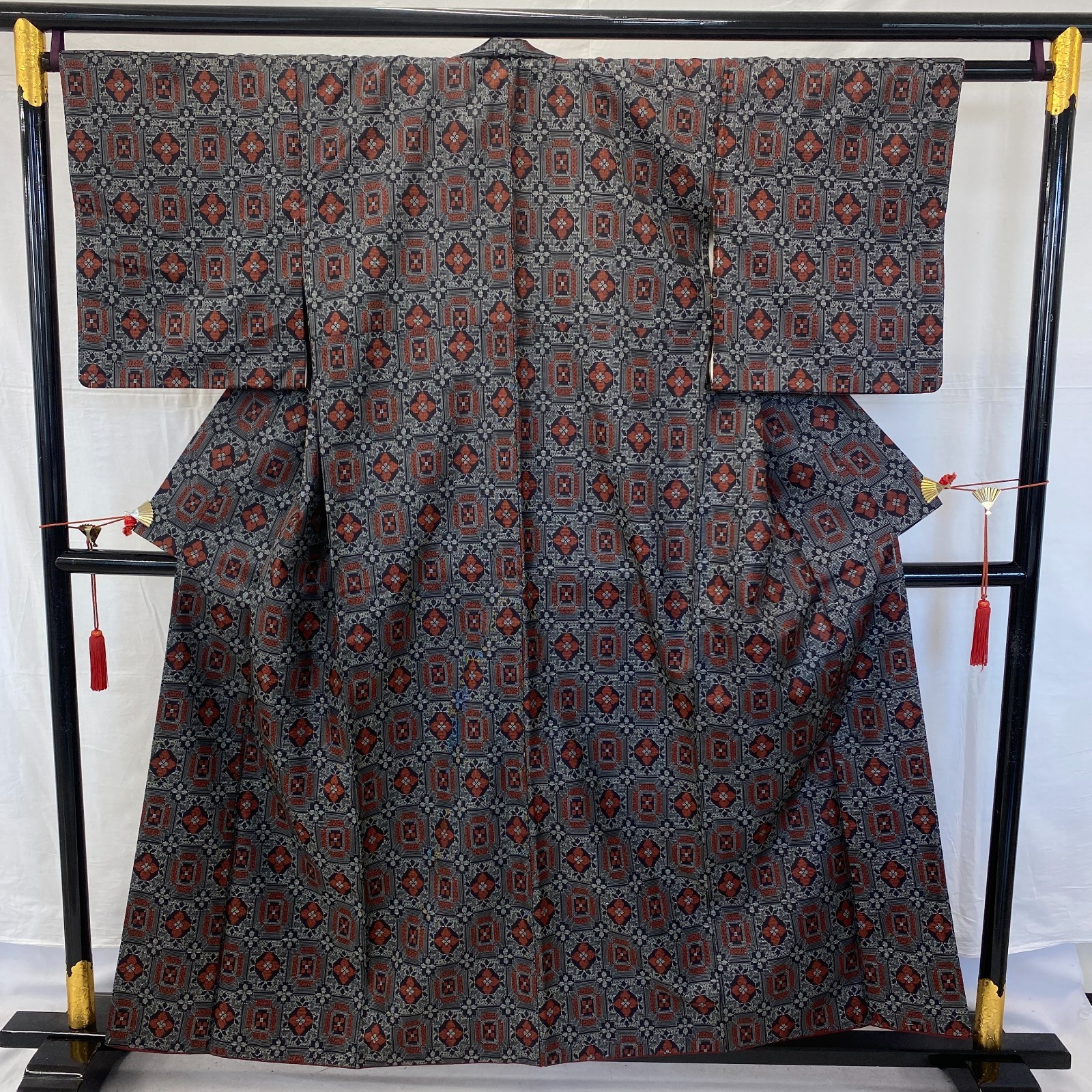 Japanese Vintage Kimono Silk Black Oshima Traditional Authentic Length 61 in