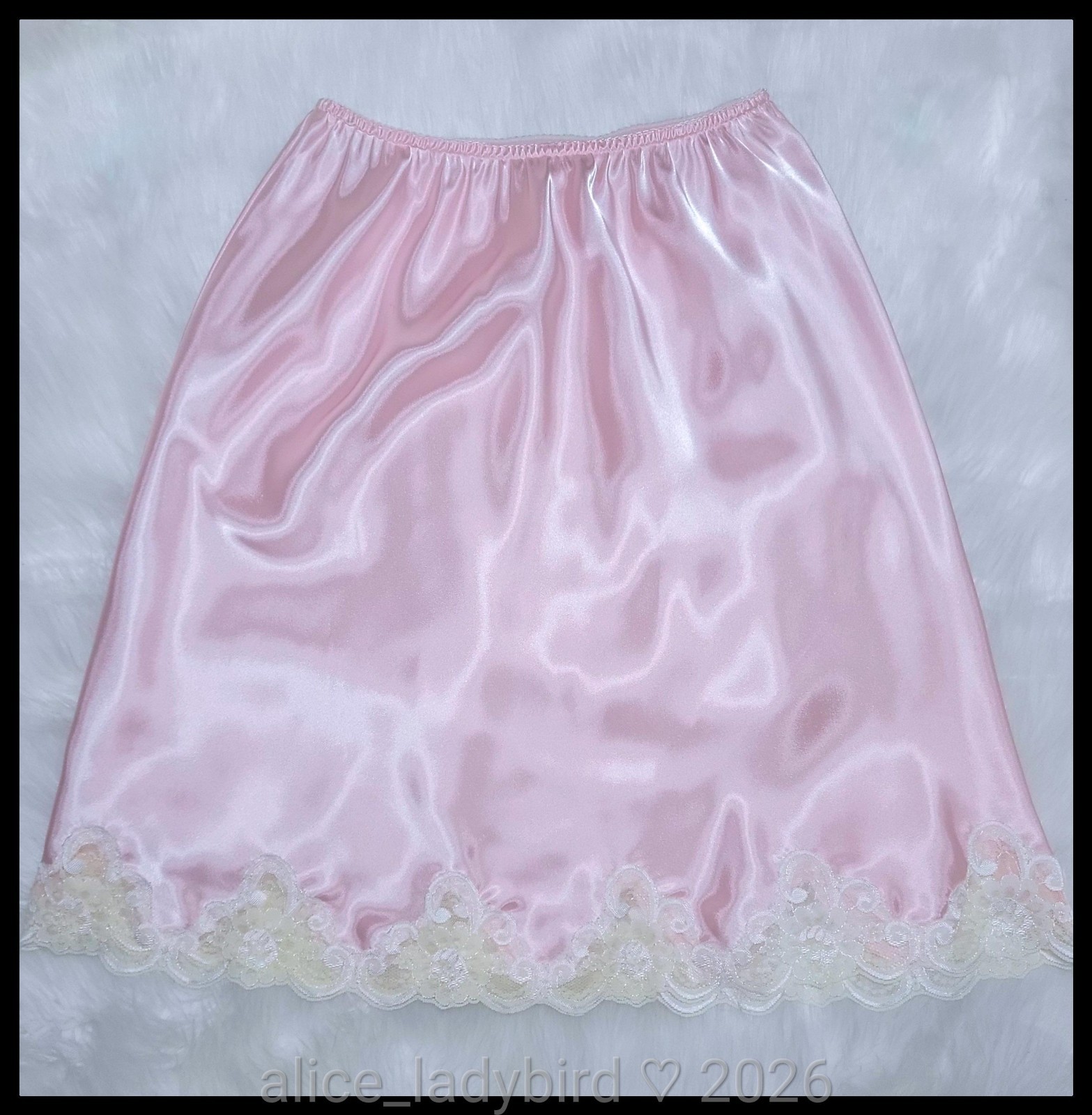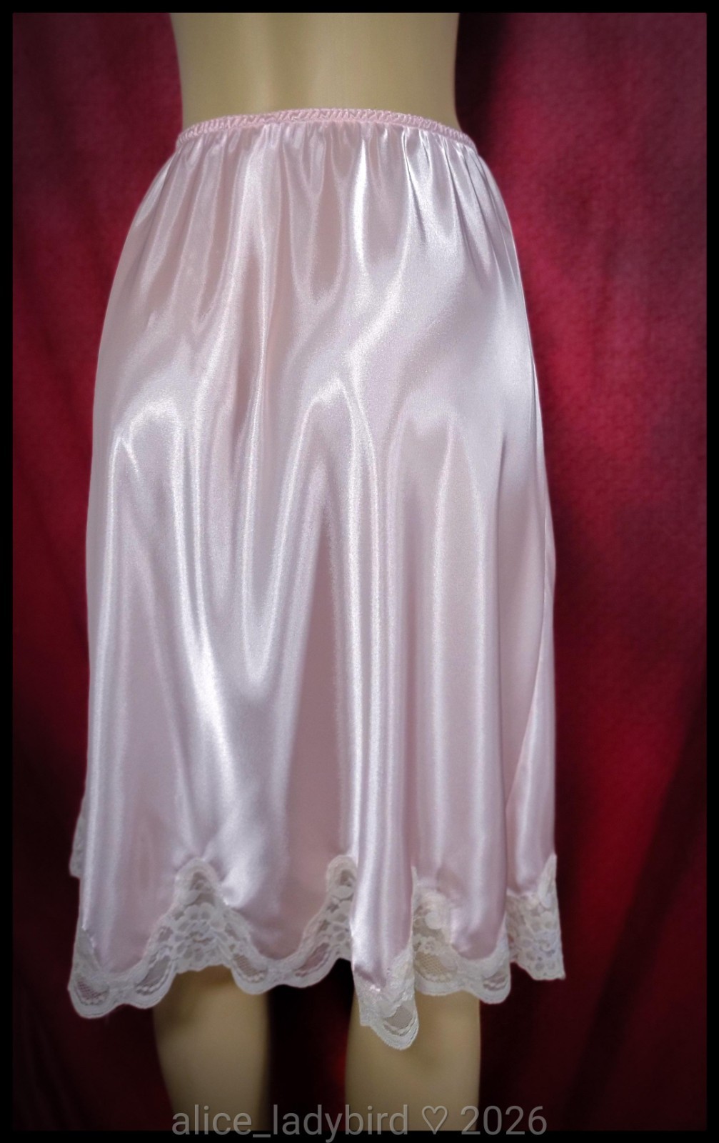 GLOSSY Vintage SHINY Liquid SATIN Half SLIP Skirt SLIPPERY Pink Lace L/XL