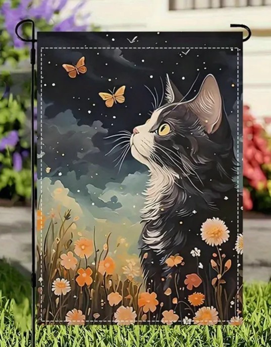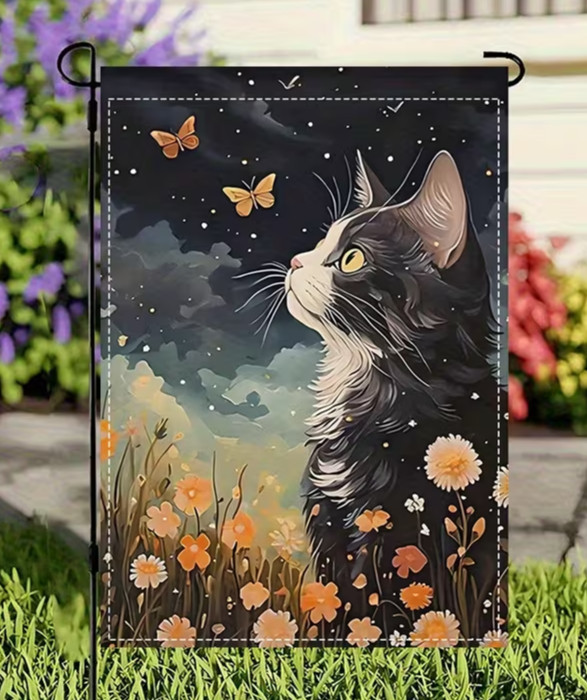 как выглядит "New" Tuxedo Cat In The Flowers, Two-Sided Burlap Type Outdoor Garden/Yard Flag фото