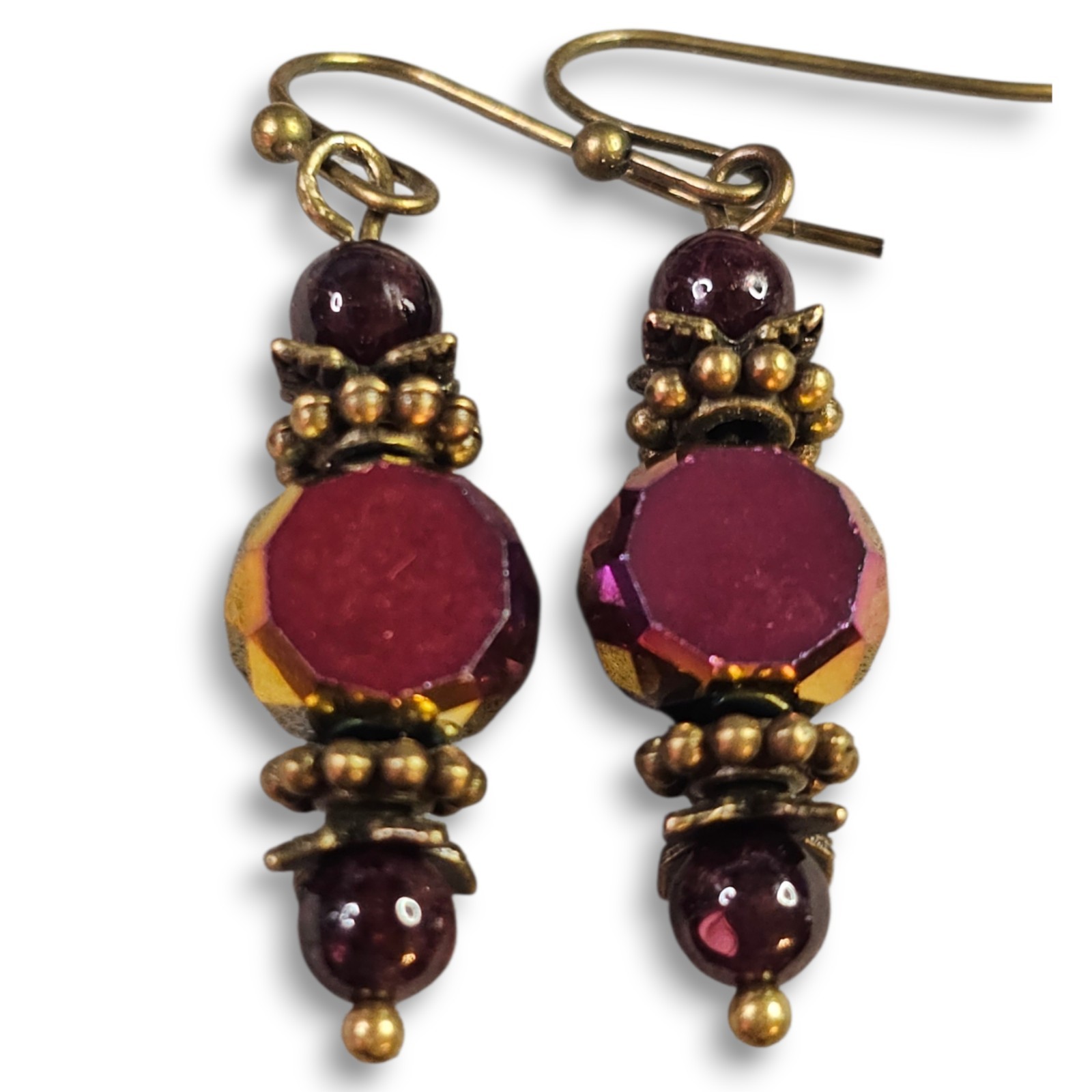 Garnet Crystal Earrings Antique Bronze Dangle Drop Hook Handmade