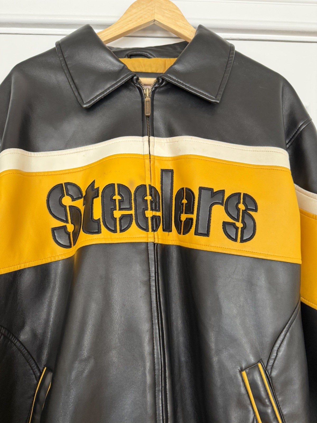 • NFL Pittsburgh Steelers Faux Leather Distressed Jacket Men s Large