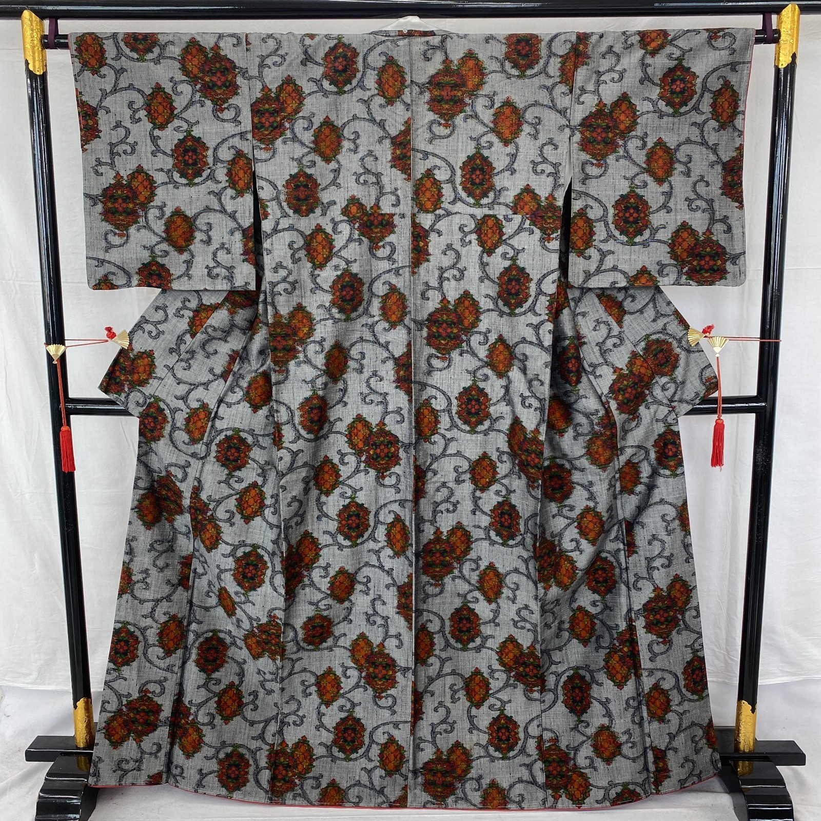 Japanese Vintage Kimono Silk Gray Tumugi Traditional Authentic Length 64 in