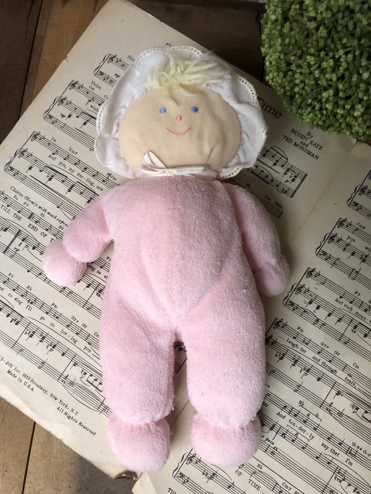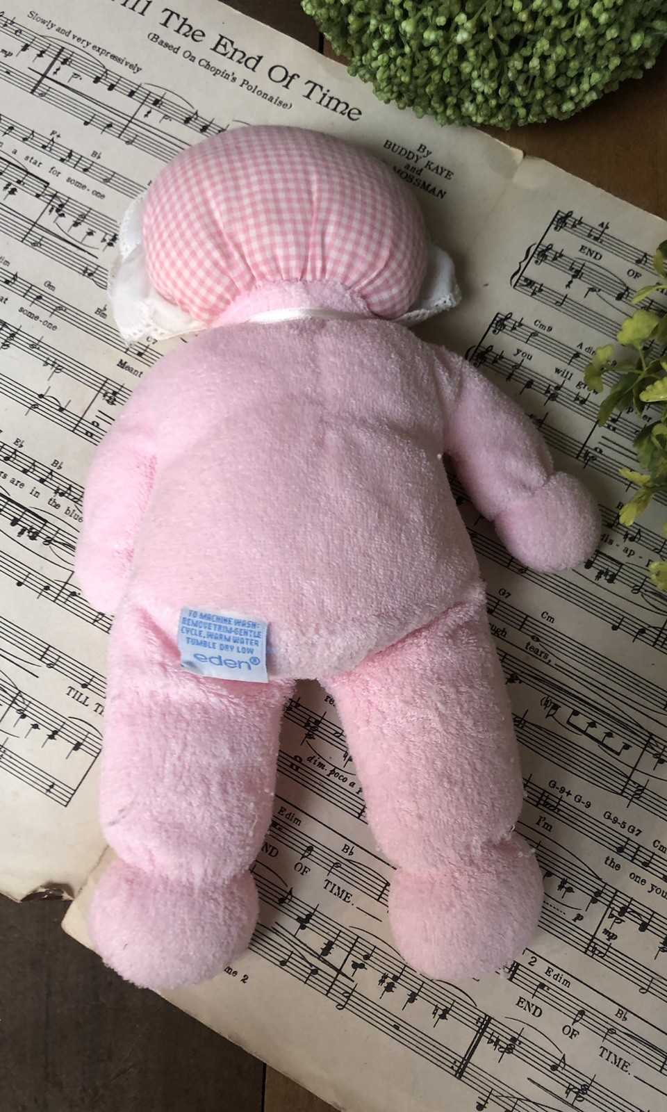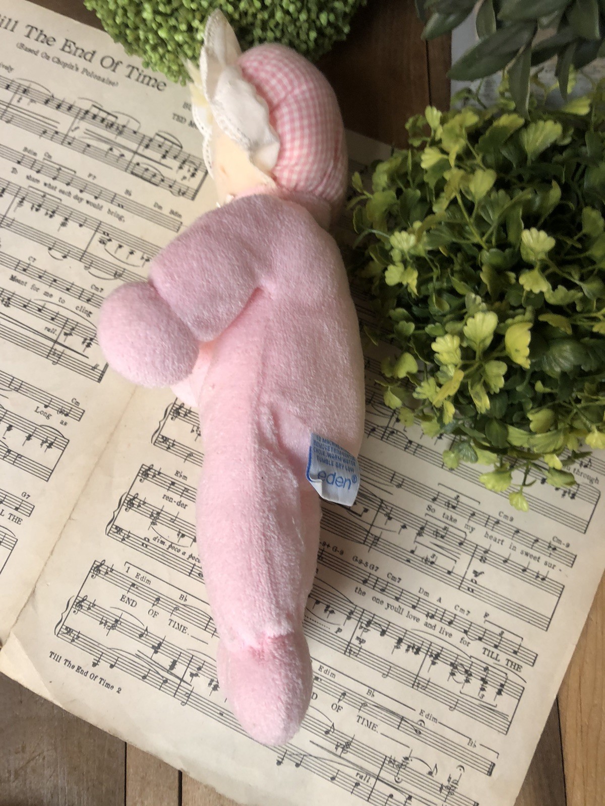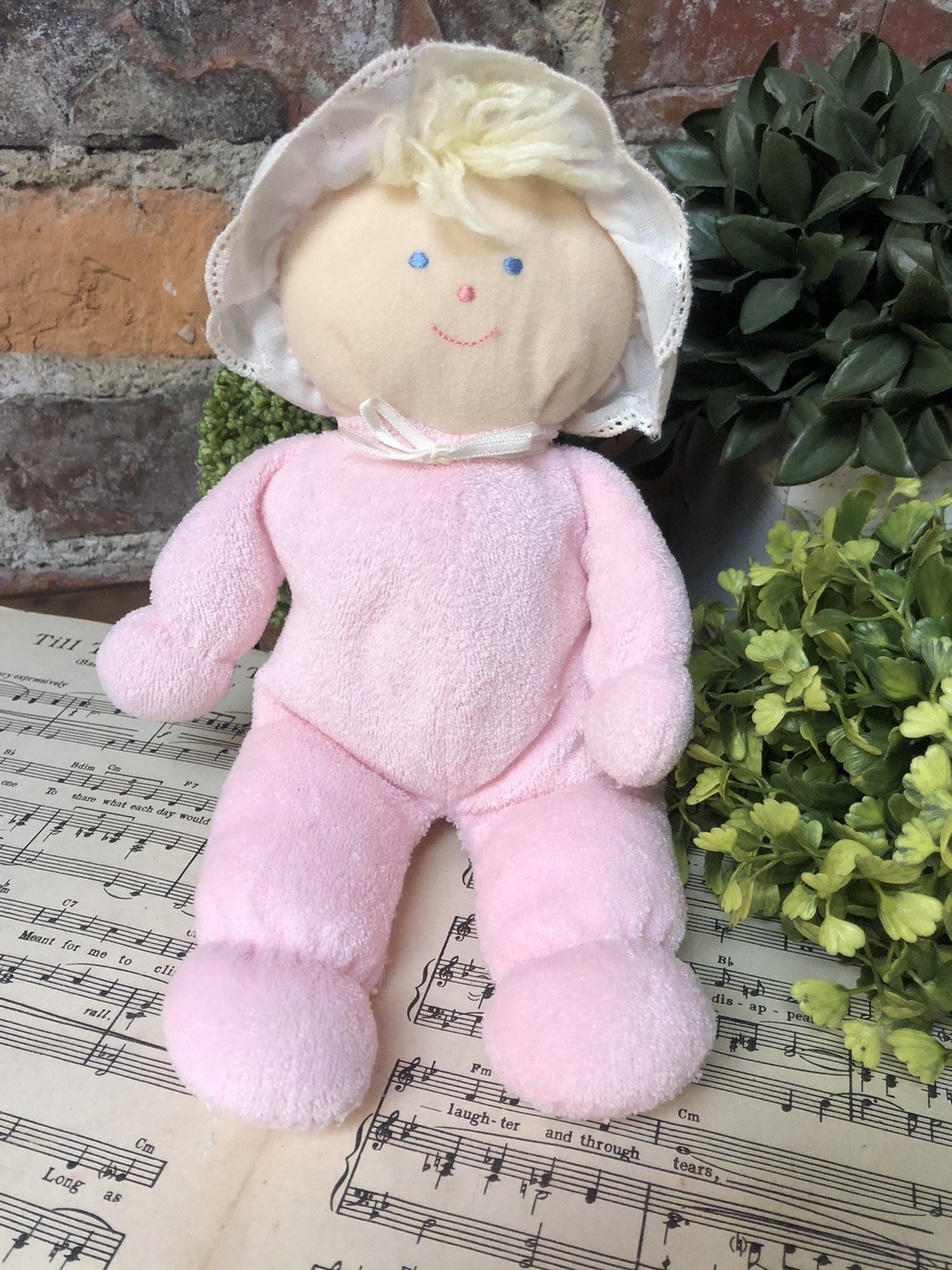 Eden Girl Baby Doll Lovey Pink Terry Cloth Blonde Hair Blue Eyes Gingham Bonnet