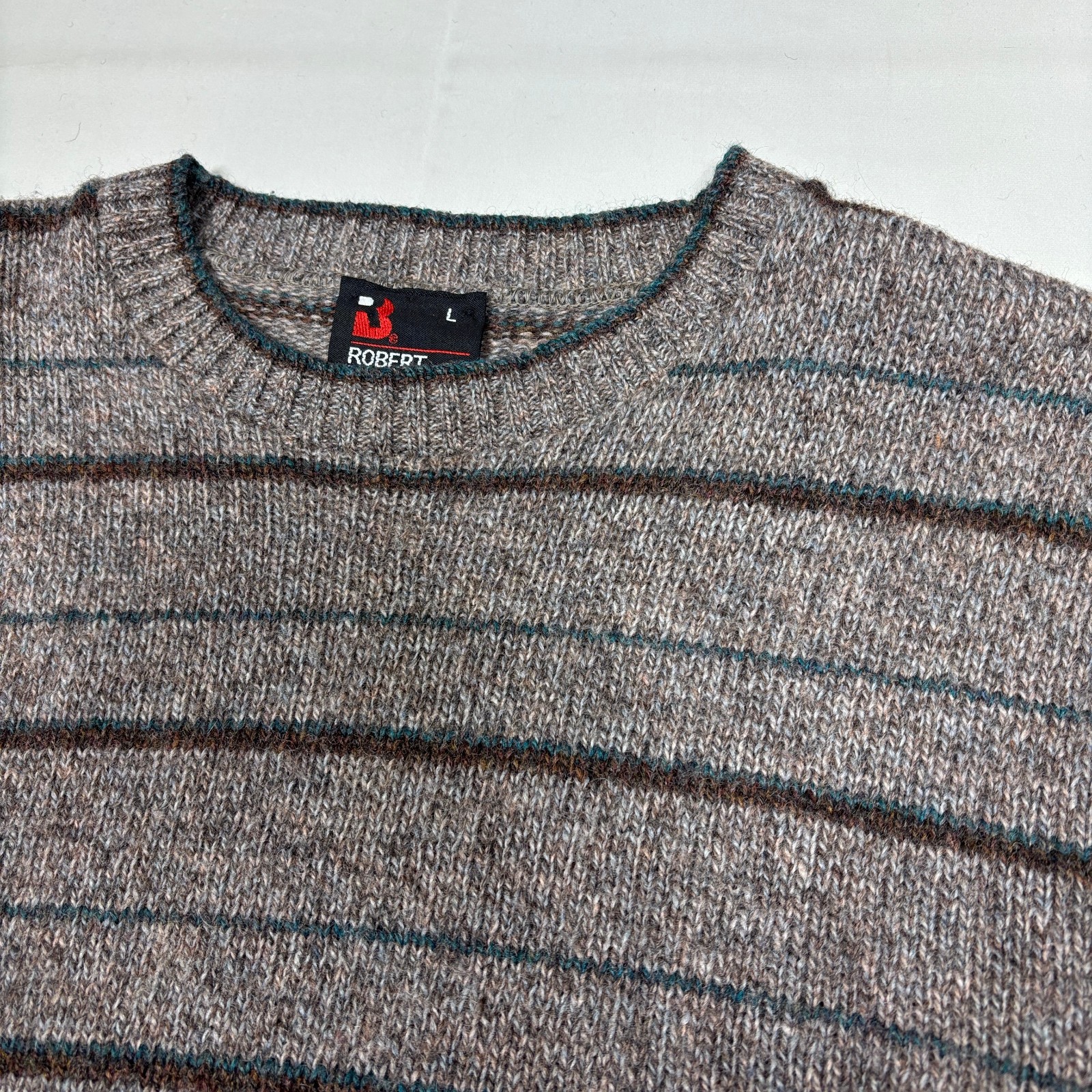 как выглядит Vintage Robert Bruce Brown Striped Wool Crewneck Sweater Made In USA Mens Large фото