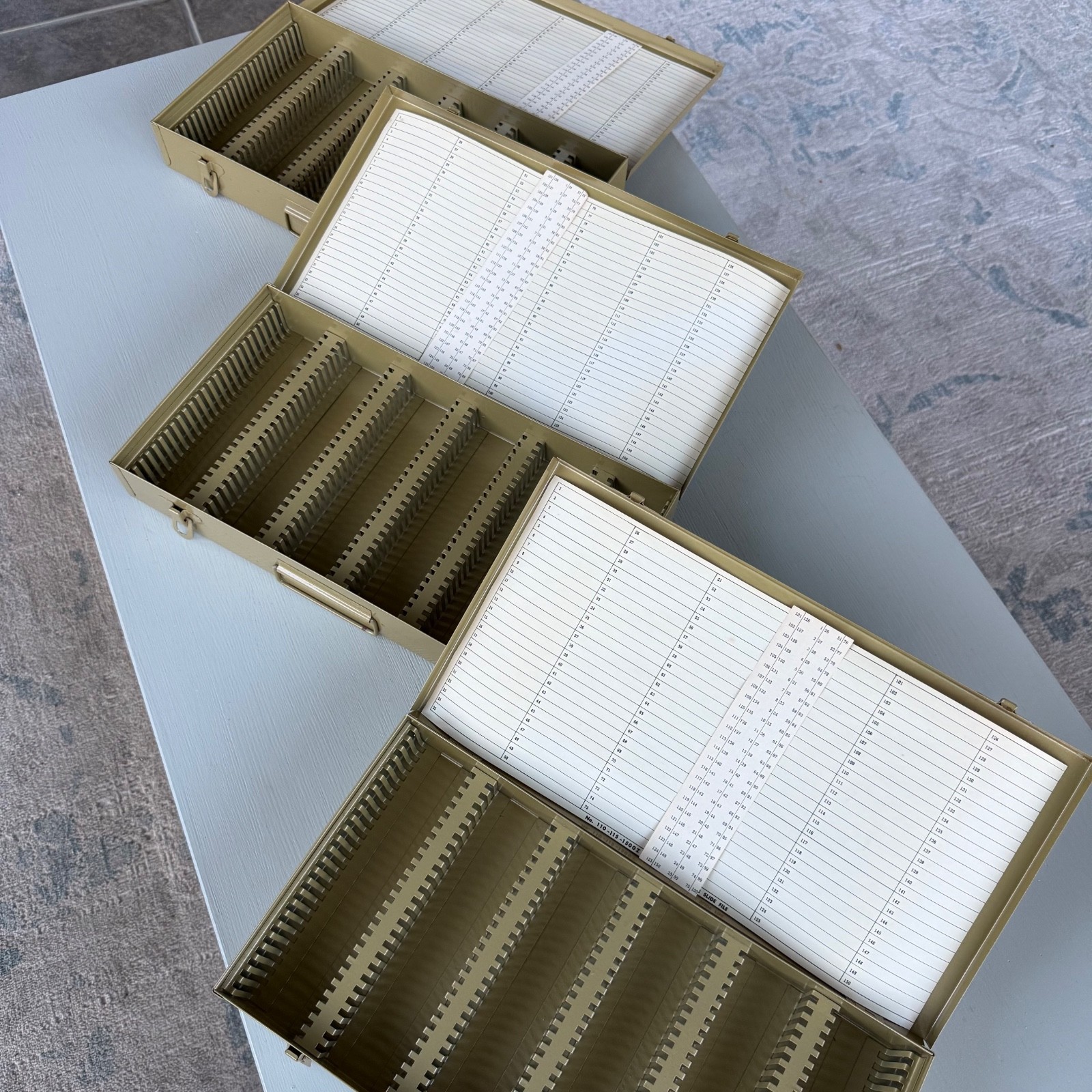 Lot of 3 Vintage Logan Slide File Boxes Case Metal Deluxe No 110 NOS Index Chart