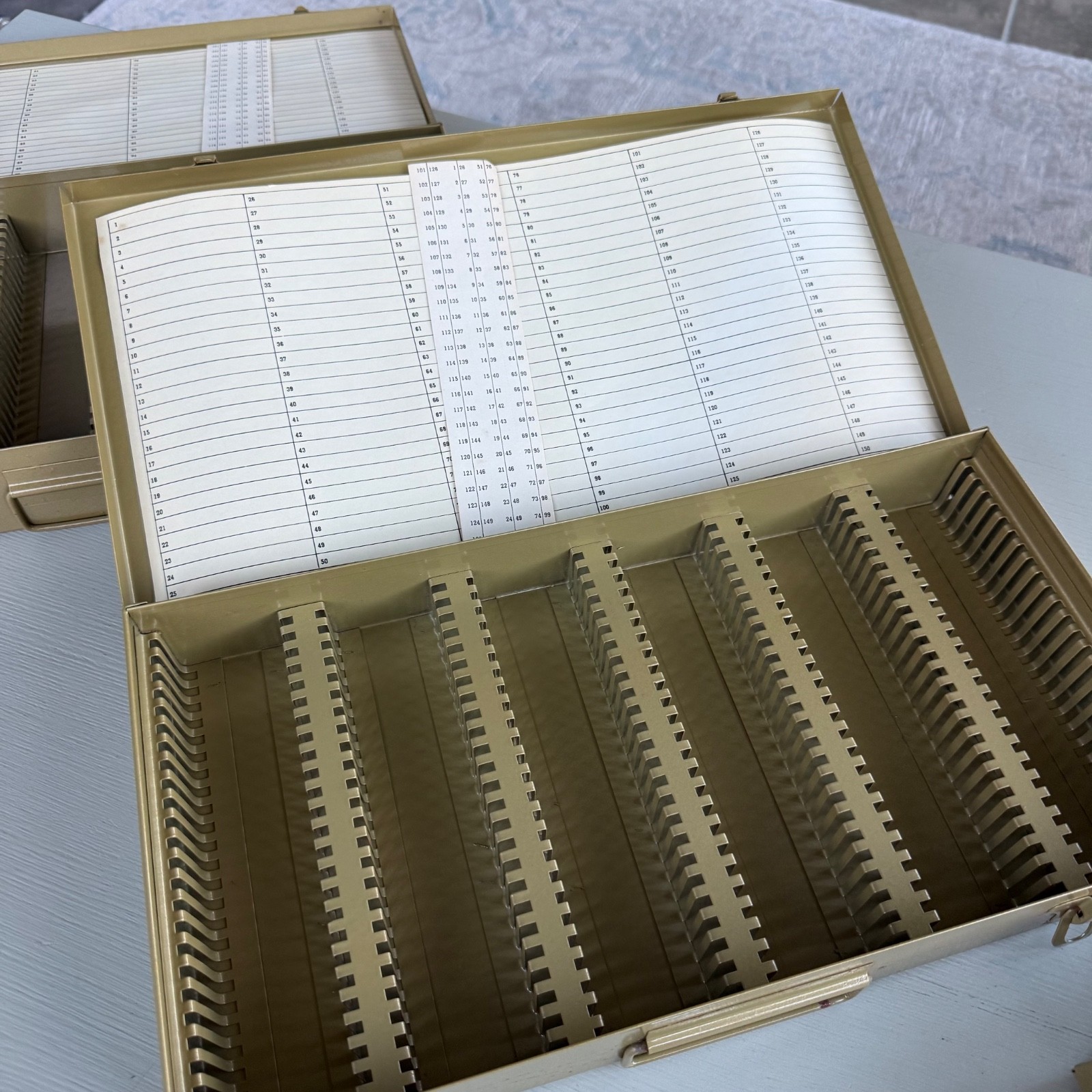 как выглядит Lot of 3 Vintage Logan Slide File Boxes Case Metal Deluxe No 110 NOS Index Chart фото