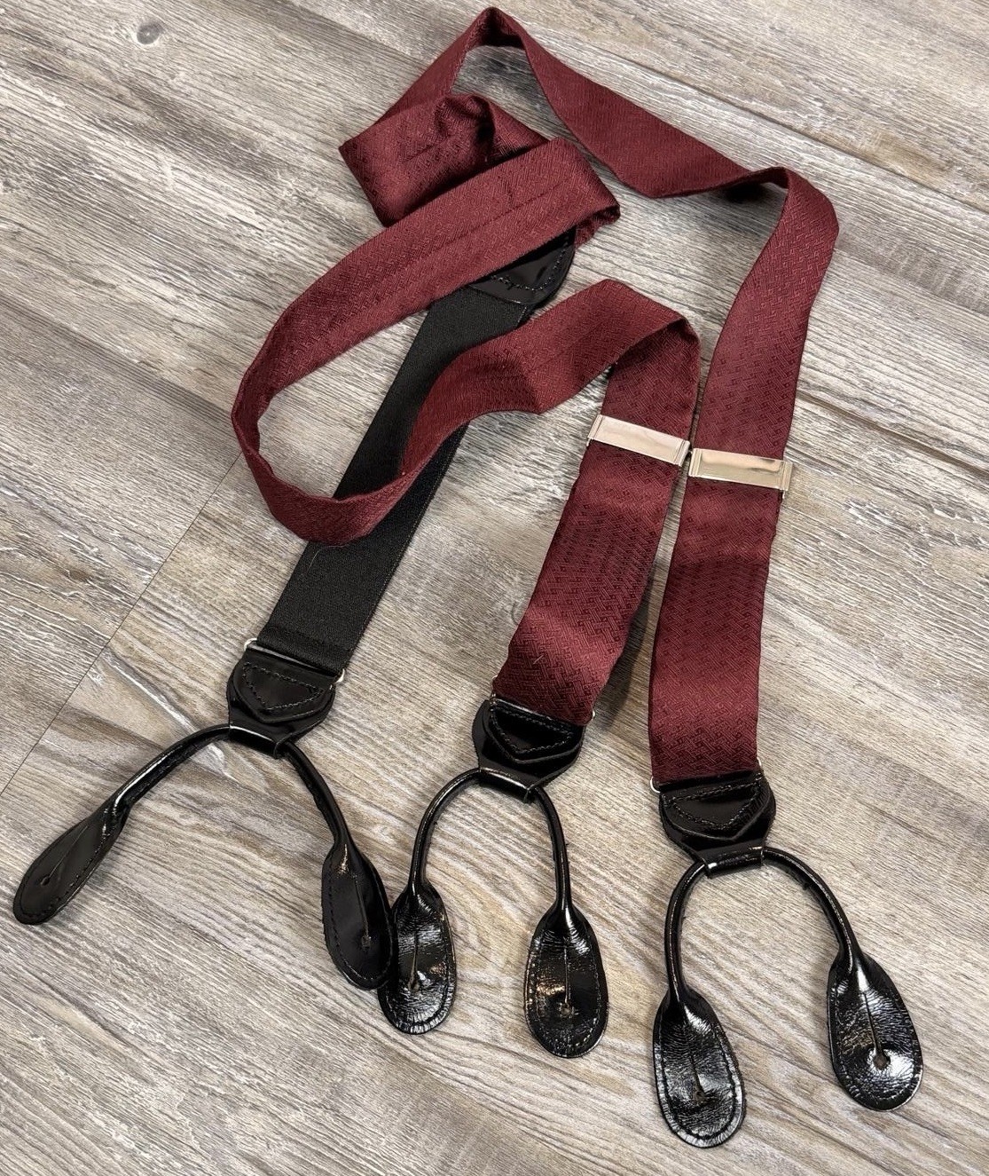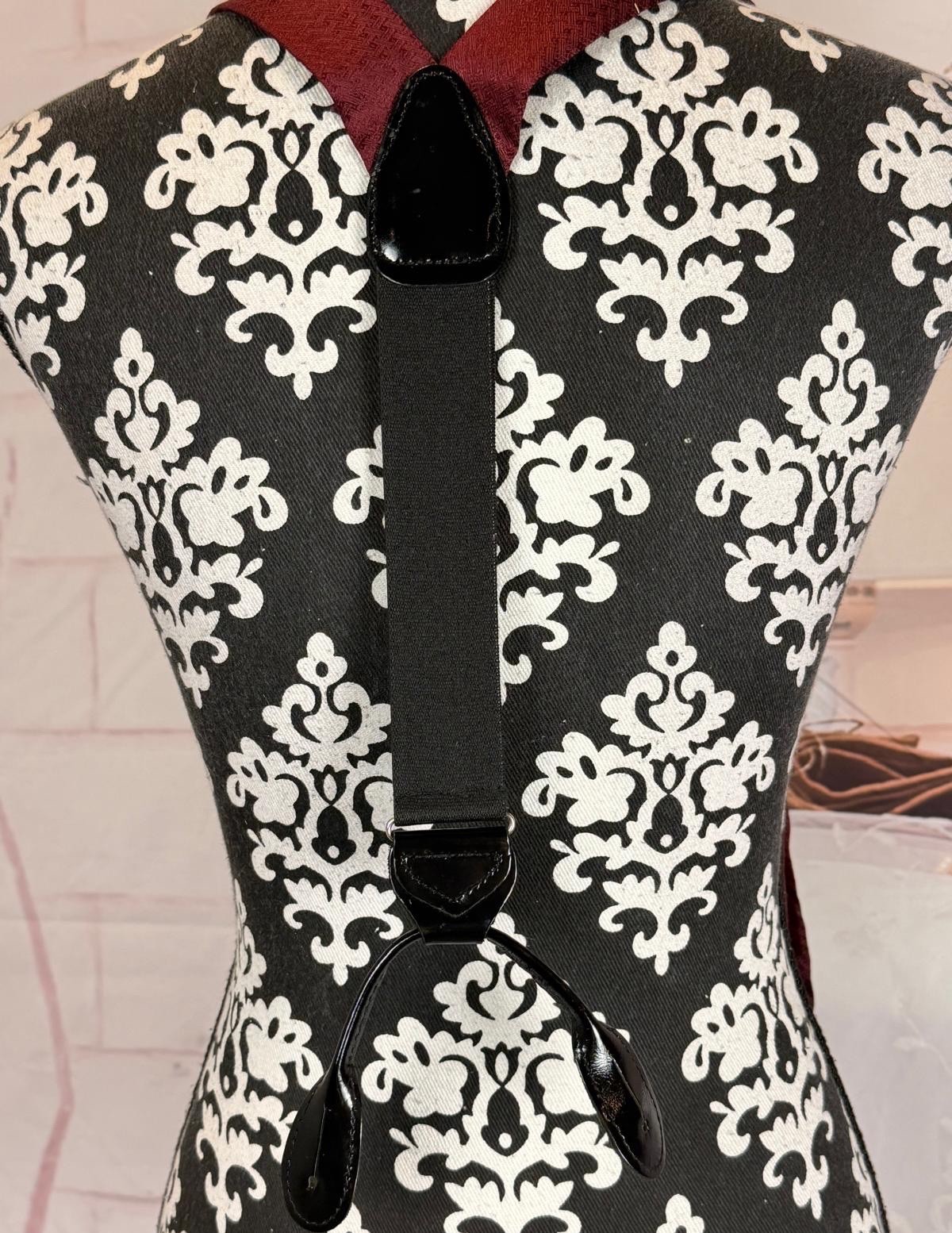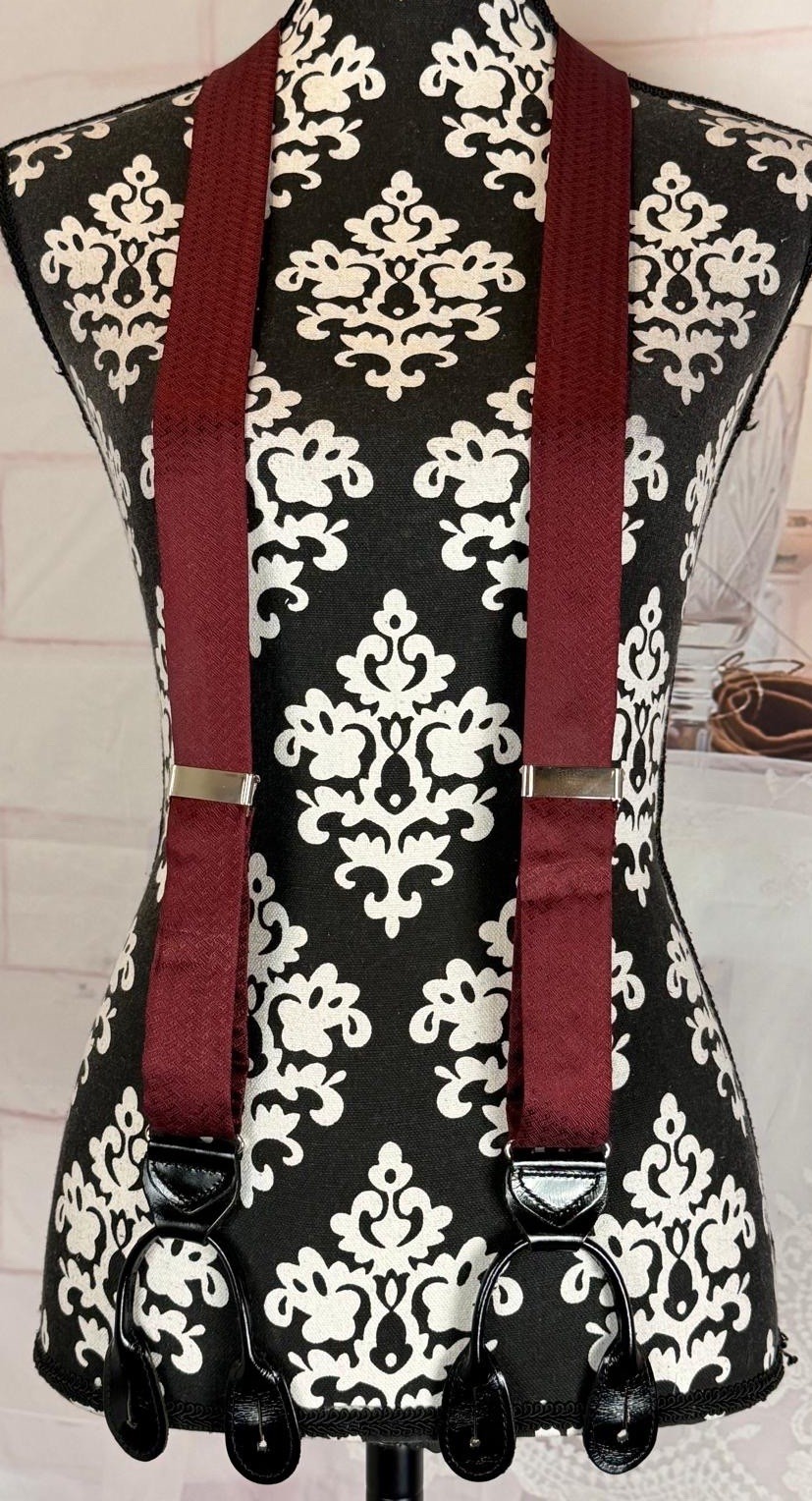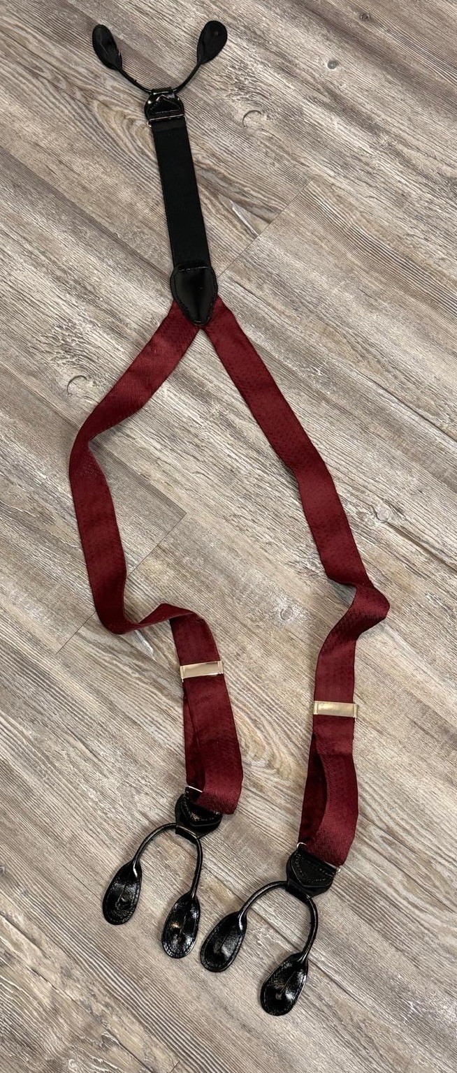 VTG Men s Burgundy 100 Silk Black Pattern Leather Button Holders Suspenders OS