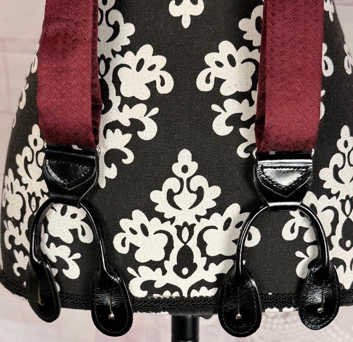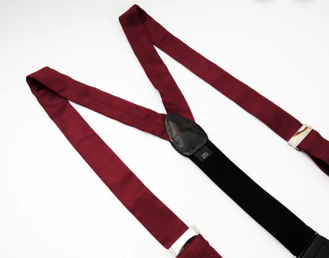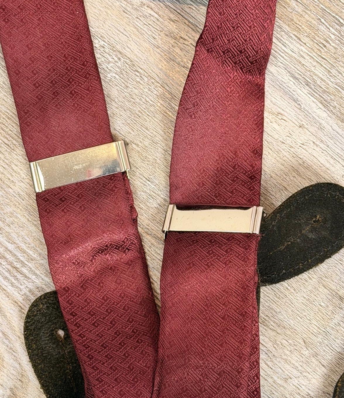 VTG Men s Burgundy 100 Silk Black Pattern Leather Button Holders Suspenders OS
