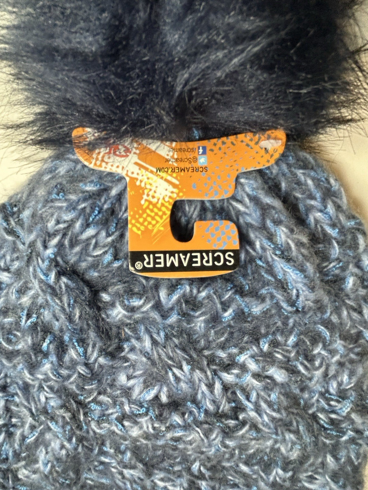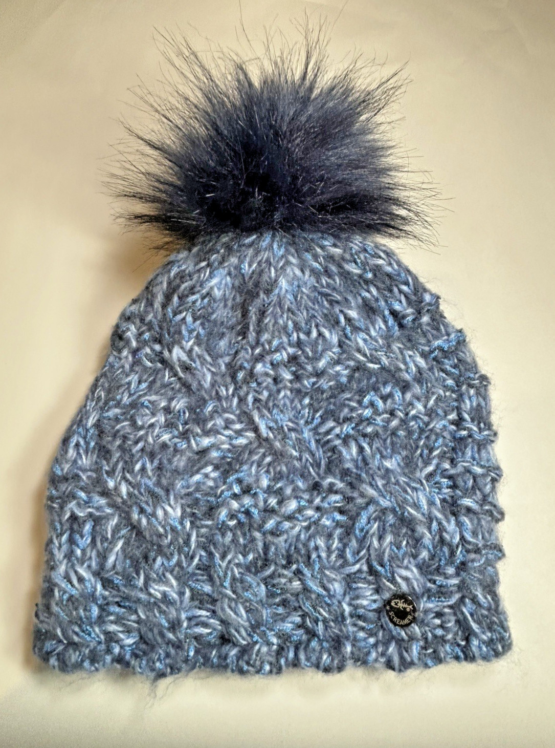 как выглядит SCREAMER HEAVY KNIT BEANIE CAP WINTER HAT - FAUX FUR POM - BLUE - O/S NEW фото