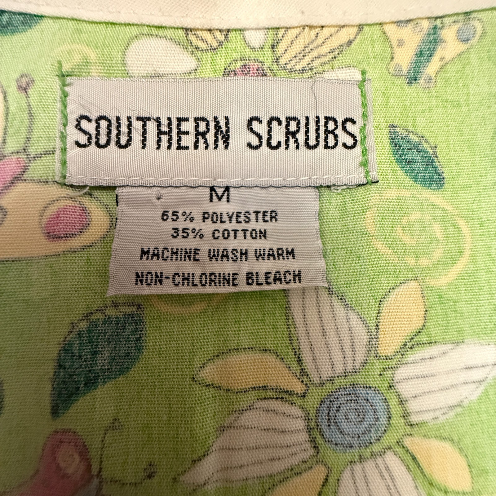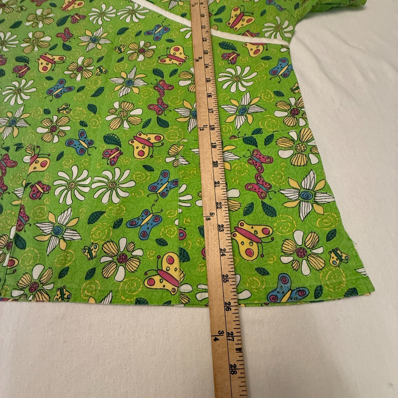 Southern Scrubs Uniform Top Green w/Flowers Butterflies Medium Preowned X-47