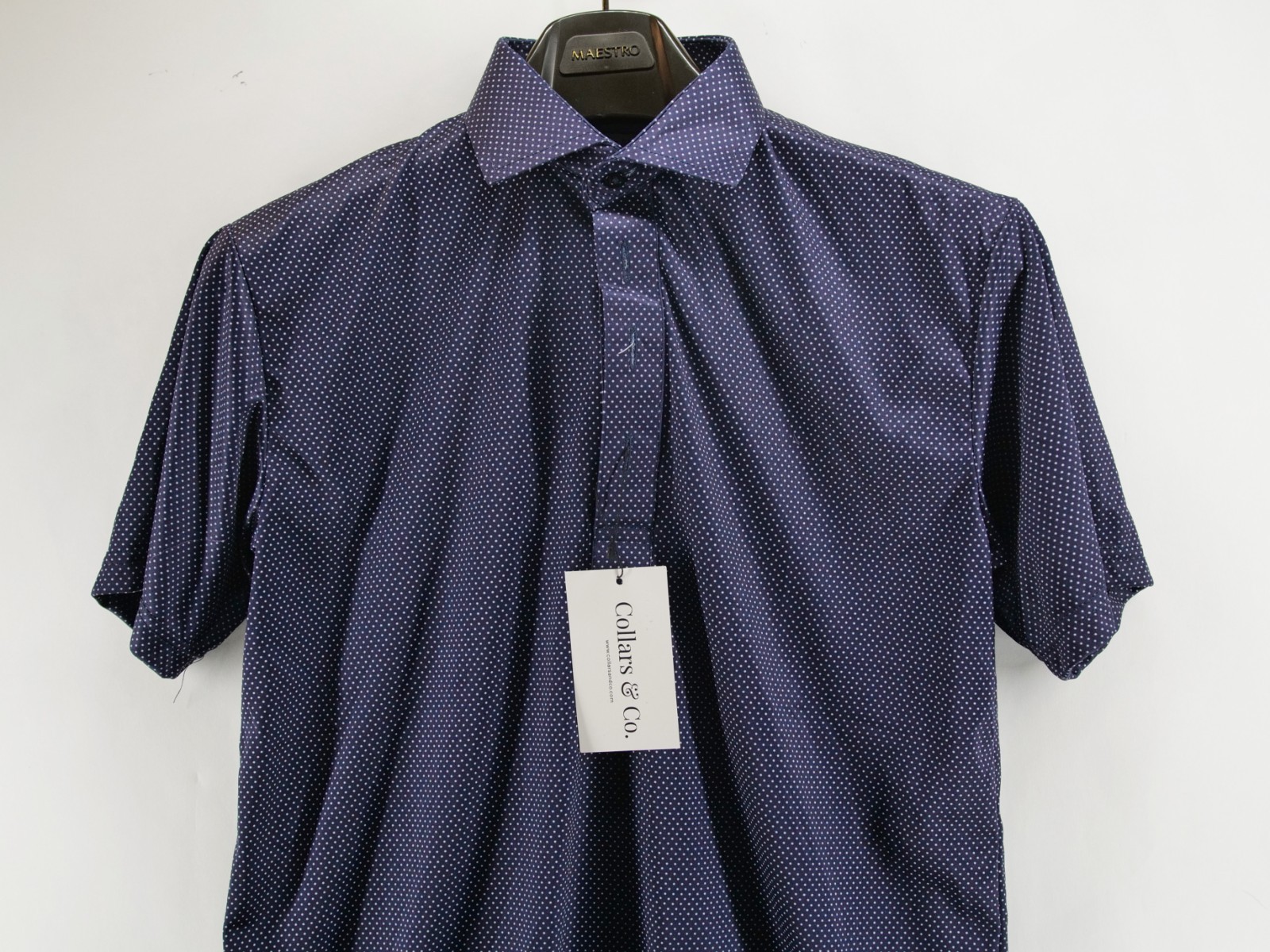 Collars and Co Men's Small Original Semi-Spread Collar Polo Blue Polka Dot