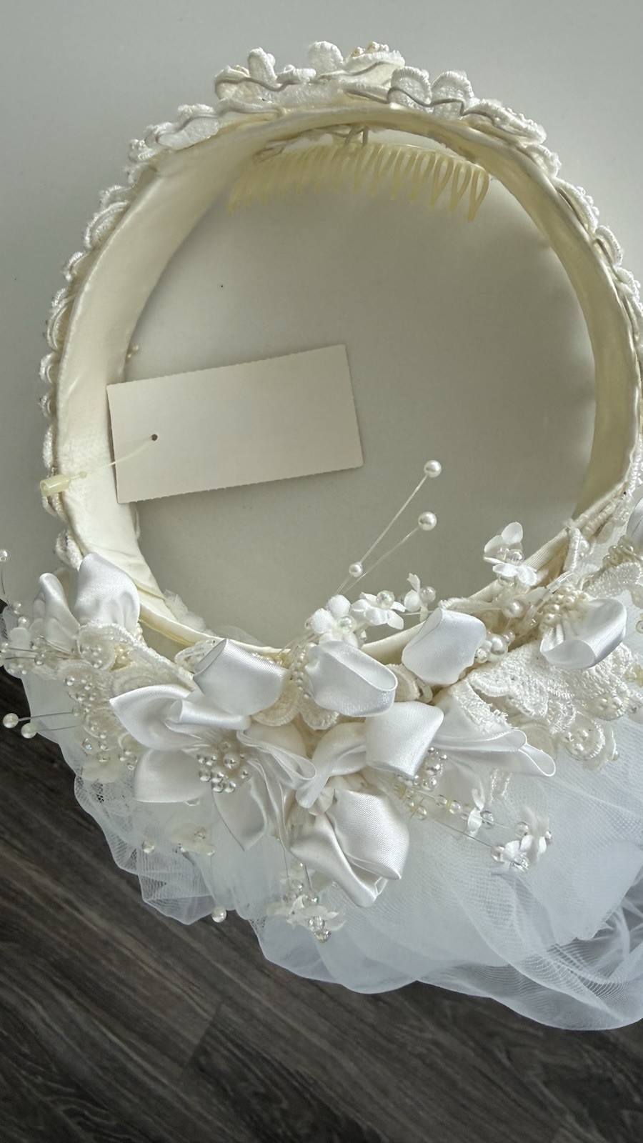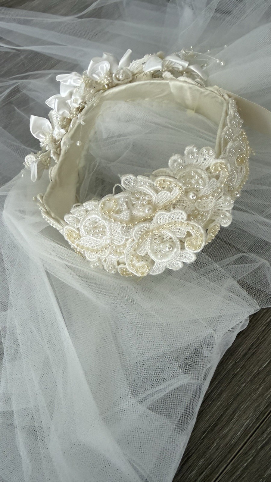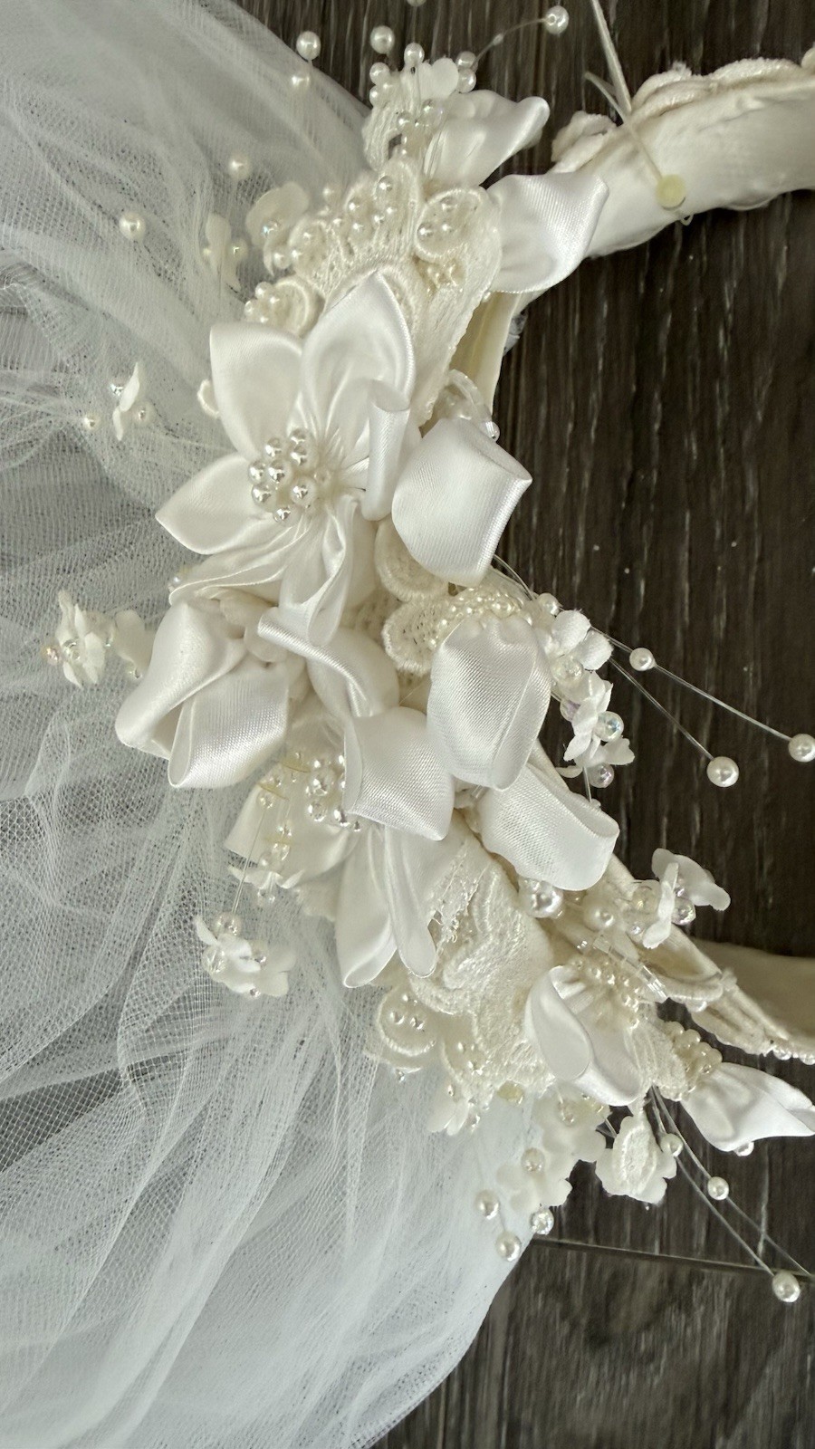 Ivory White Lace Pearl Bridal Veil Headpiece Floral Vintage Wedding Crown