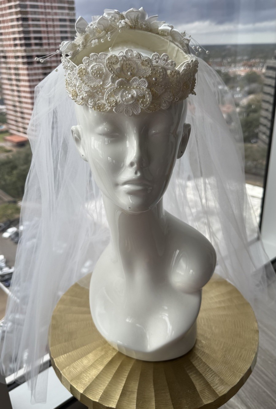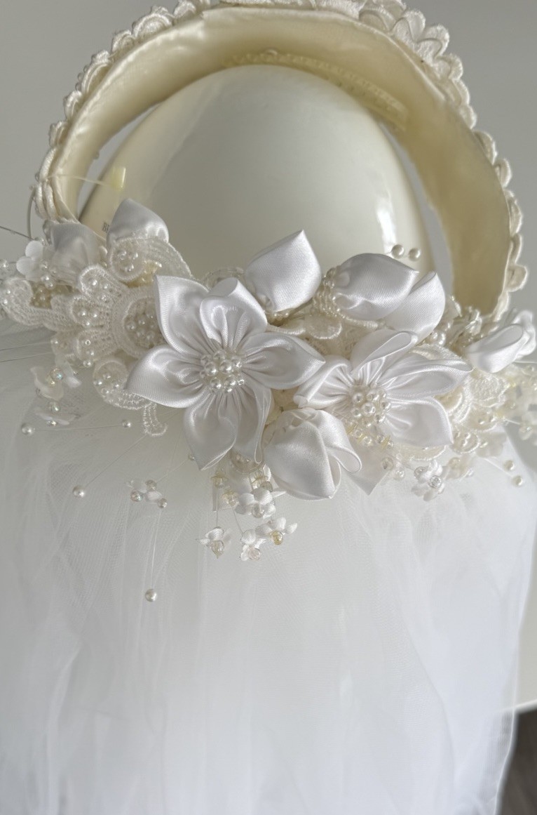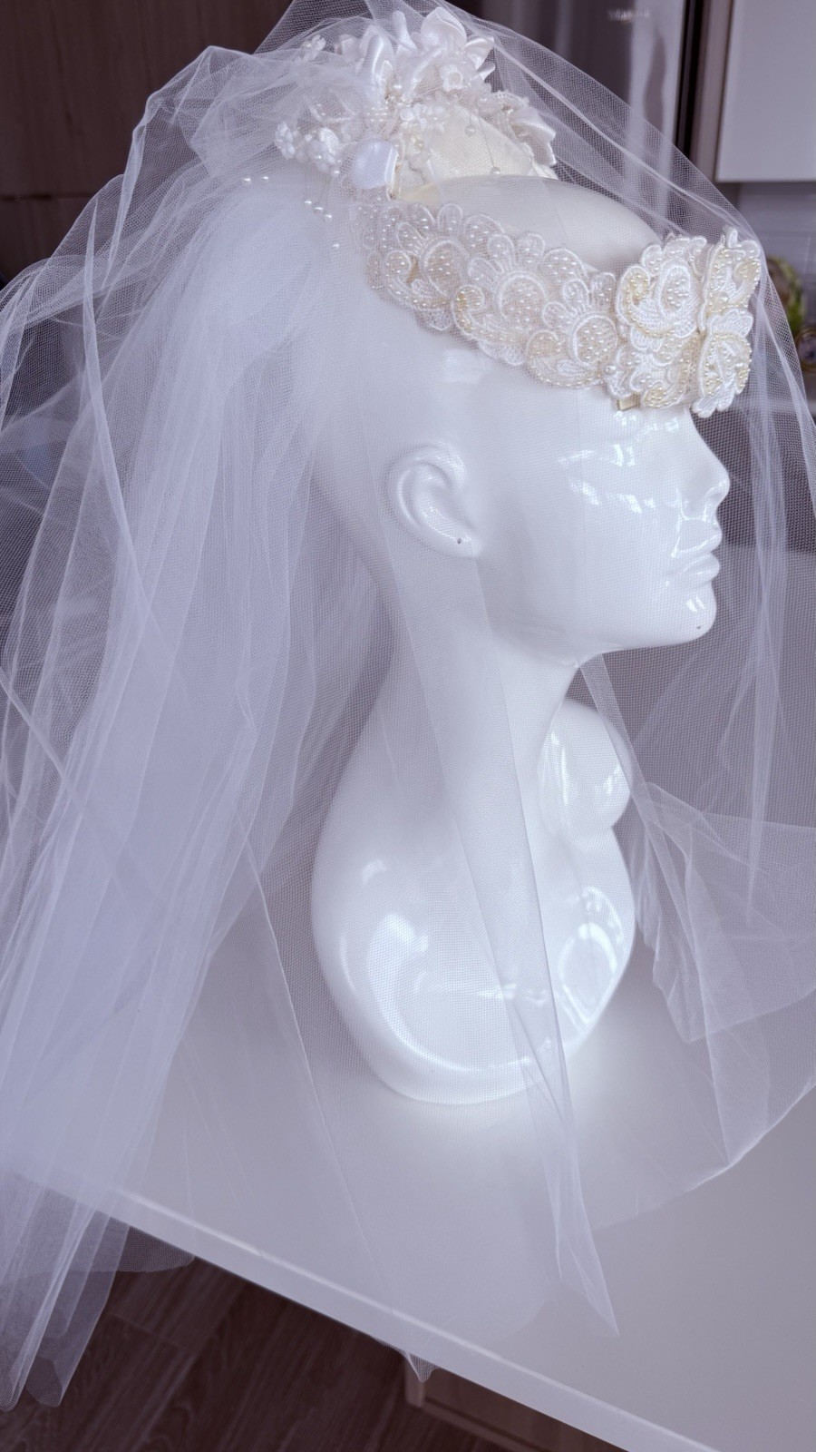 Ivory White Lace Pearl Bridal Veil Headpiece Floral Vintage Wedding Crown