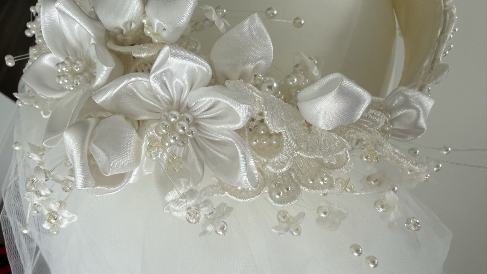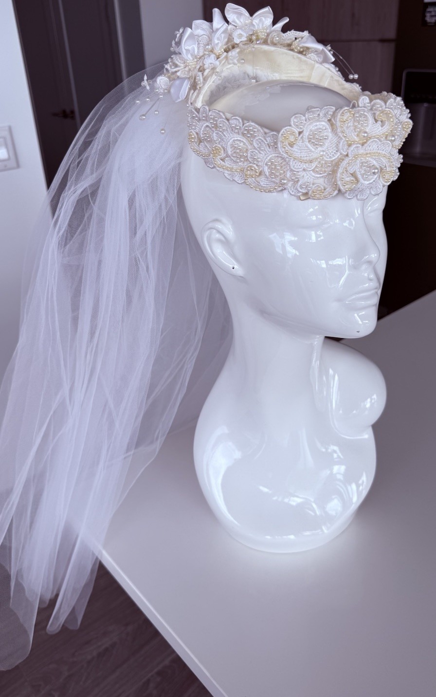 как выглядит Ivory White Lace Pearl Bridal Veil Headpiece Floral Vintage Wedding Crown фото