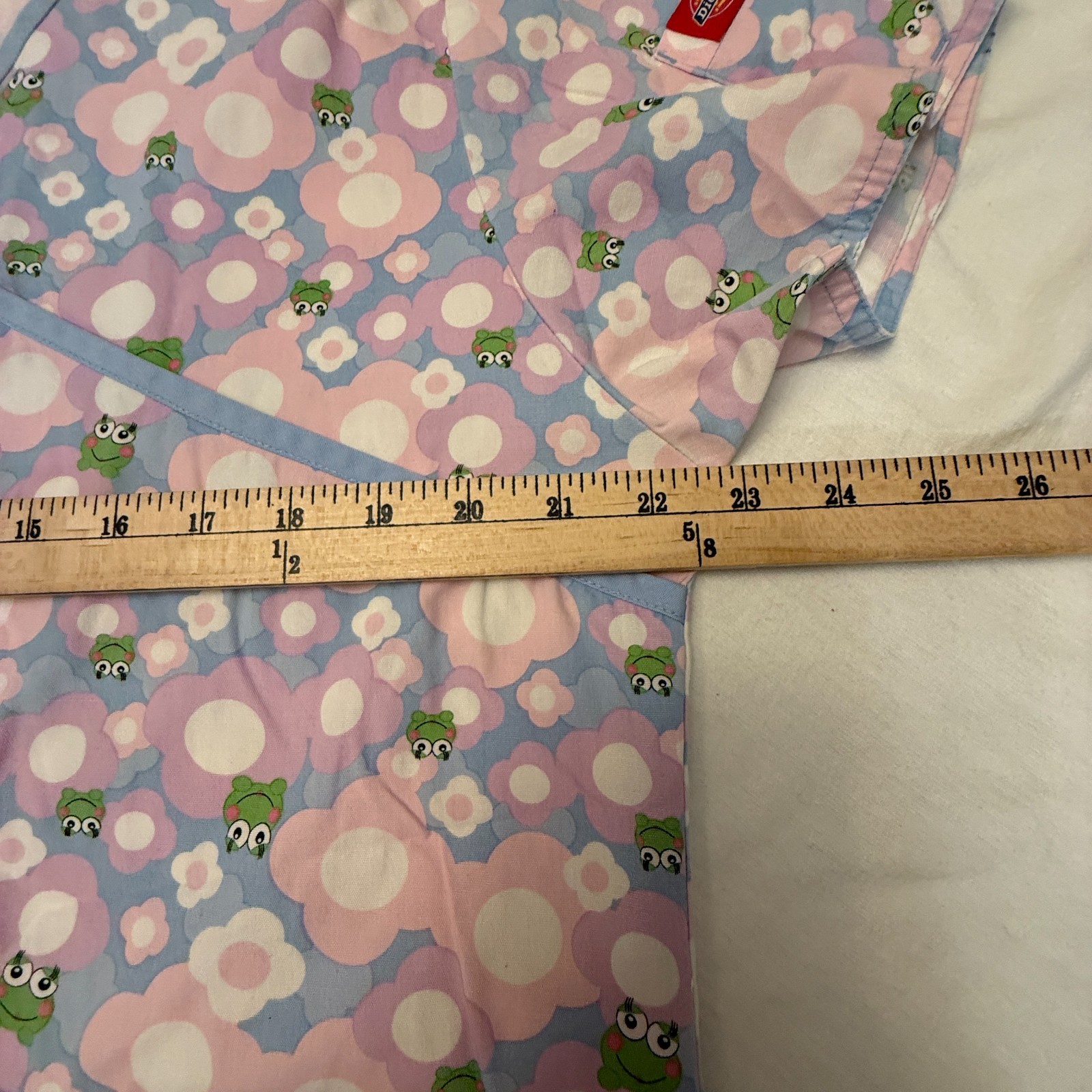 как выглядит Dickies Uniform Scrub Top Blue w/Frogs Flowers Pastels Large Preowned A3-4 фото