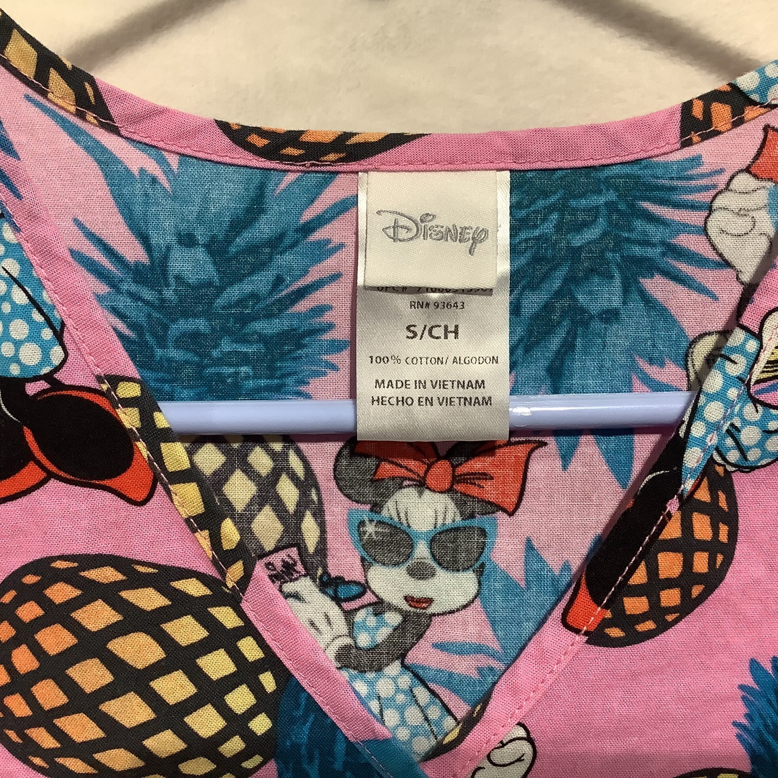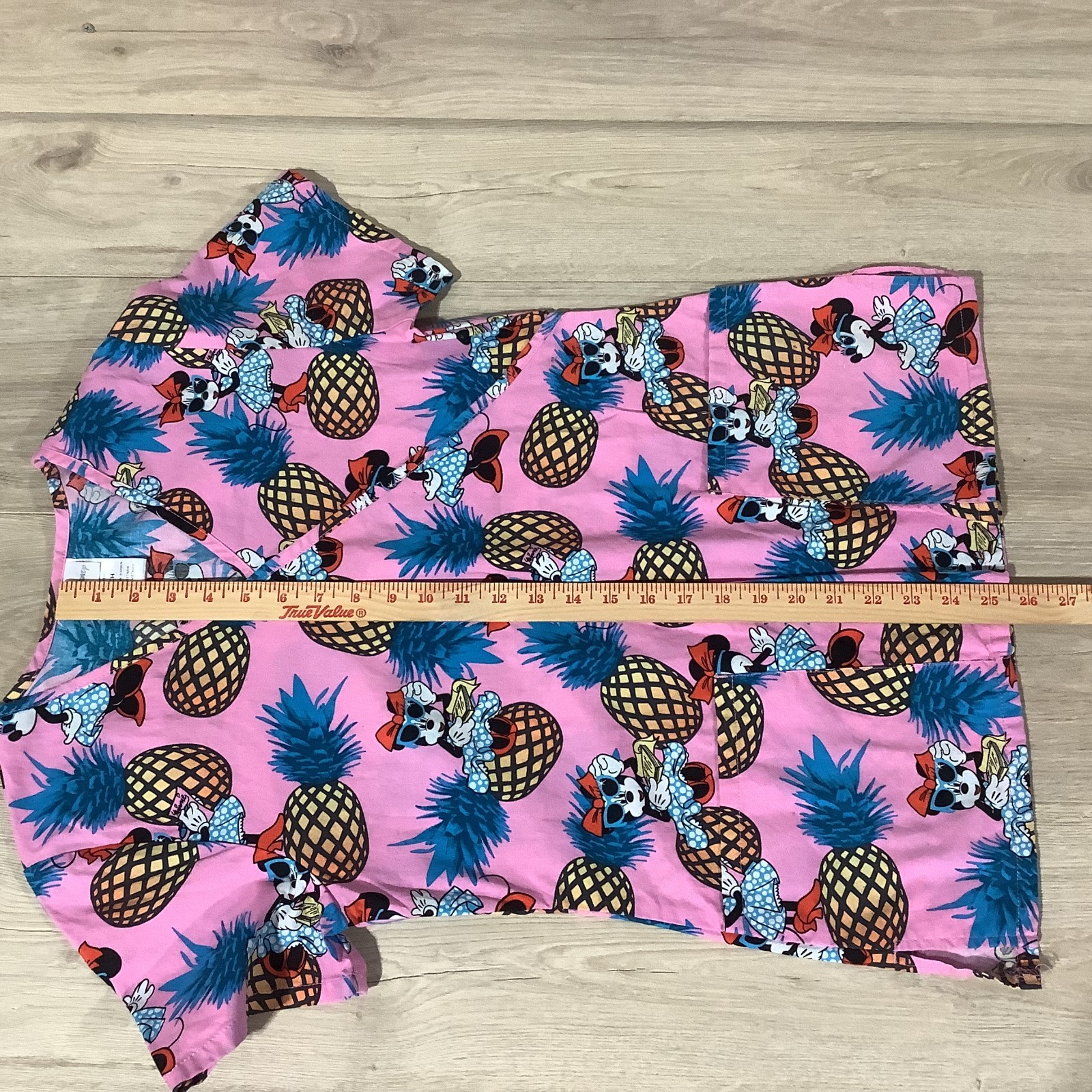 как выглядит Disney Women Scrub Top Sz S Minnie Mouse Pineapples Wrap-Style Front Pocket Pink фото