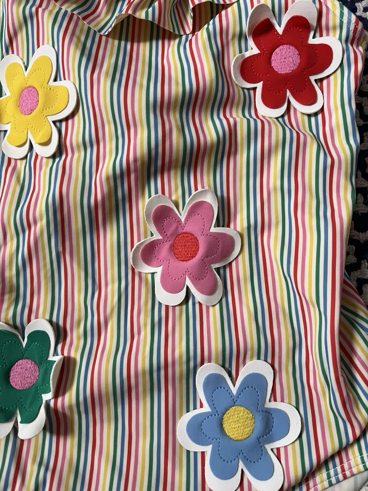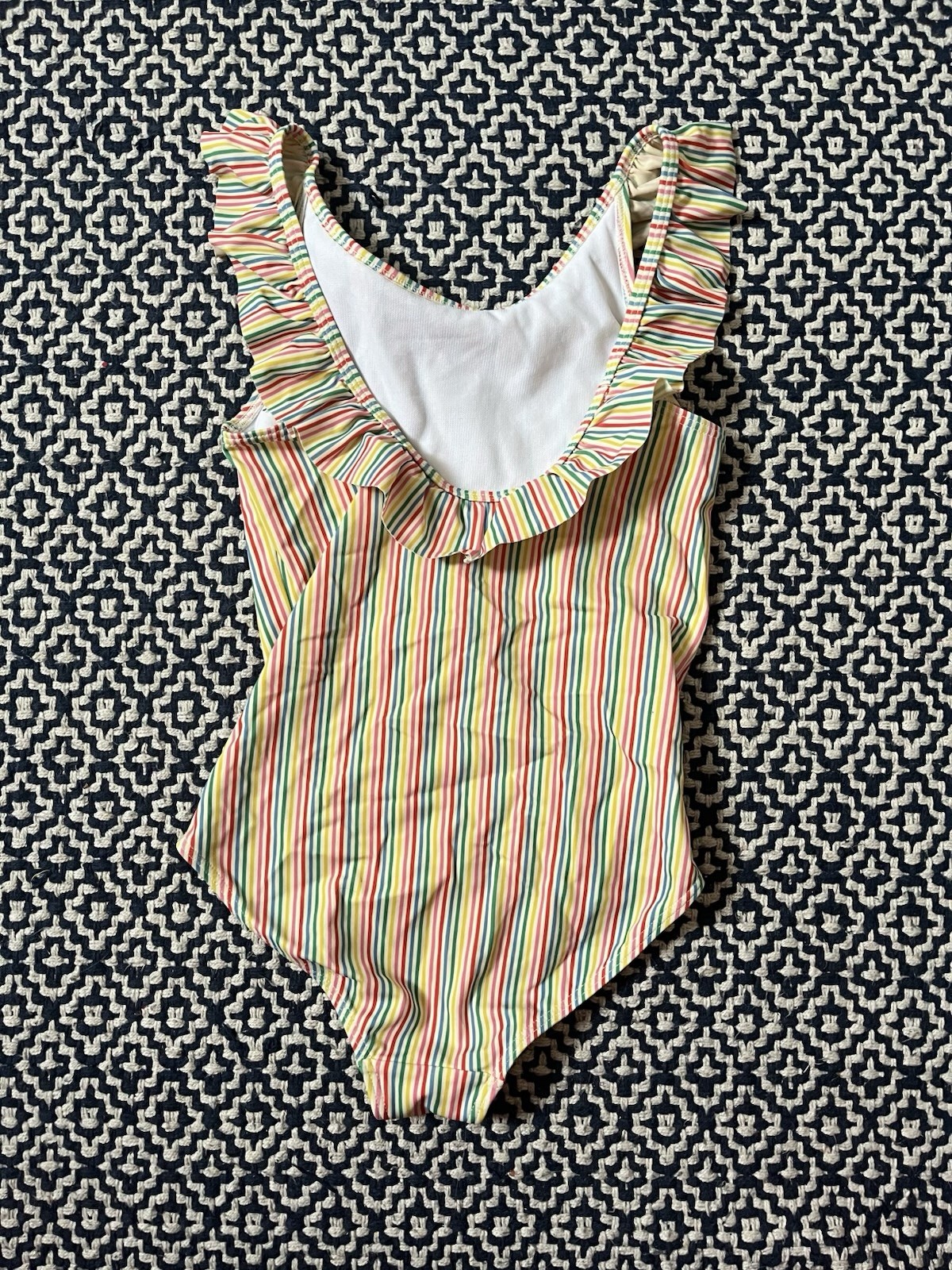 как выглядит EUC Mini Boden Flower Appliqu Rainbow Stripe Ruffle One Piece Swimsuit 8/9 фото