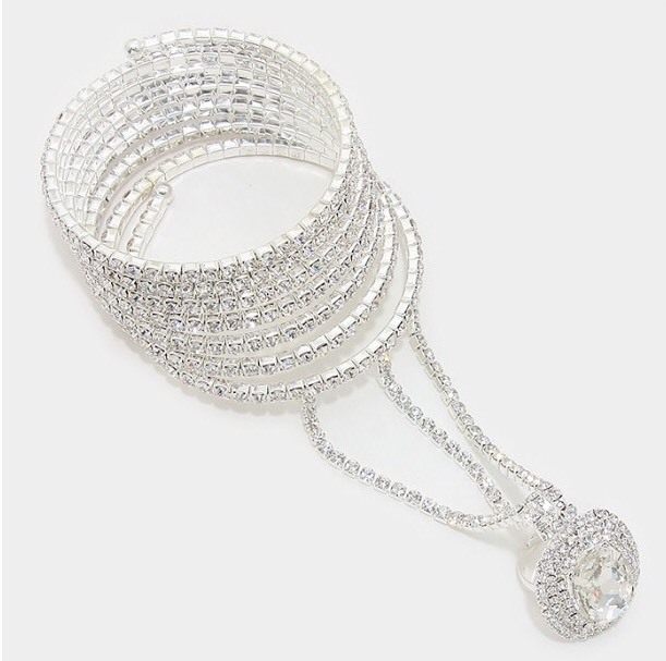 Silver Clear Bracelet Crystal Rhinestone Bridal Formal Slave Hand Chain Ring