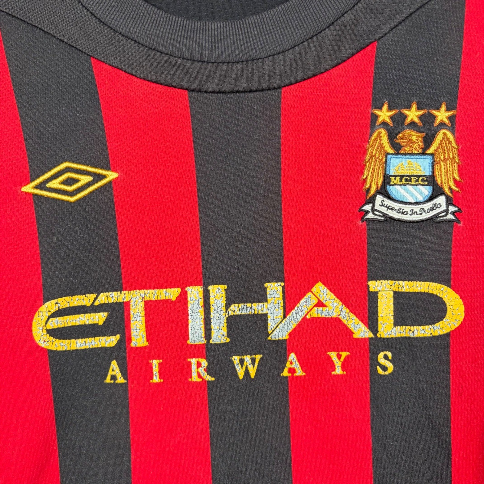 Umbro Manchester City 2011-12 Away Jersey Red Black Striped MCFC Youth Sz M